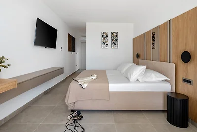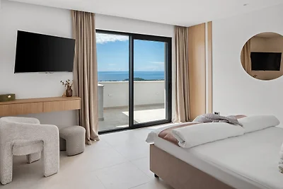 Hoofdslaapkamer nr. 6 bevindt zich op de eerste verdieping met uitzicht op het zwembad en de zee. Slaapkamer nr. 1 (28 m²) met een kingsize bed (180 cm x 200 cm), en suite badkamer (12 m²) met douche en bad, airconditioning, tv, balkon en uitzicht op zee.