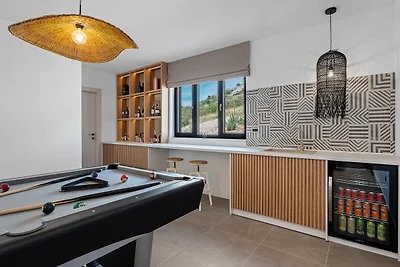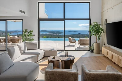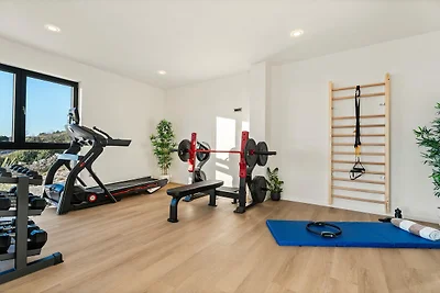 * Buiten: Er is een verwarmd, infinity-stijl privézwembad van 64 vierkante meter (14,9 x 4,3 meter) met hydrotherapie en een ondiep gedeelte uitgerust met twee ligstoelen voor de ideale verfrissende ervaring. Het chloorvrije zwembadwater biedt de ideale omgeving voor een rustgevende zwemervaring, een zonneterras met zeven ligstoelen en een buitendouche. Het buitenterrein omvat een verwarmd infinity zwembad voor privégebruik, met een oppervlakte van 64 vierkante meter (14,9 x 4,3 meter), uitgerust met hydrotherapie en een ondiep gedeelte voorzien van twee ligstoelen – voor een ideale verfrissende ervaring. Het chloorvrije zwembadwater biedt de perfecte omgeving voor een ontspannende zwembeurt. Daarnaast is er een spa-gedeelte dat beschikt over een sportschool, een sauna en een massagegedeelte. Een sportschool van 28 vierkante meter met een multifunctioneel apparaat, een ergometer en Pilates-apparatuur. Naastgelegen bevindt zich een wellnessruimte van 29 m² met een Finse sauna en een bubbelbad (Hot-Tub) met uitzicht op het zwembad en de eilanden. Er is ook een apart toilet beschikbaar. De eerste verdieping biedt een mediaruimte (speelkamer) met een pooltafel, een kitchenette (aanrecht, barkrukken, glazen, gootsteen en een koelkast voor drankjes), airconditioning, een tv, een PlayStation 5-console en een comfortabele bank die kan worden omgevormd tot een slaapbank voor twee personen.