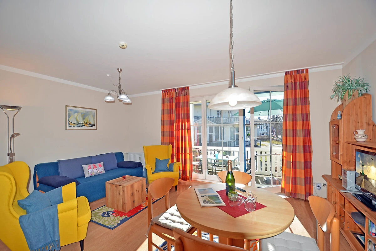 Woon-eetkamer met open keuken, gezellige slaapbank voor maximaal 2 personen (ligvlak: 150x200 cm), TV/Sat (flatscreen), gratis internet/WLAN, radio/CD, boeken en bordspellen voor gezellige avonden, volledig uitgeruste inbouwkeuken met 4-pits kookplaat (keramisch), oven, koelkast met klein vriesvak, vaatwasser, koffiezetapparaat (filter), broodrooster, waterkoker en magnetron, houten kinderstoel
