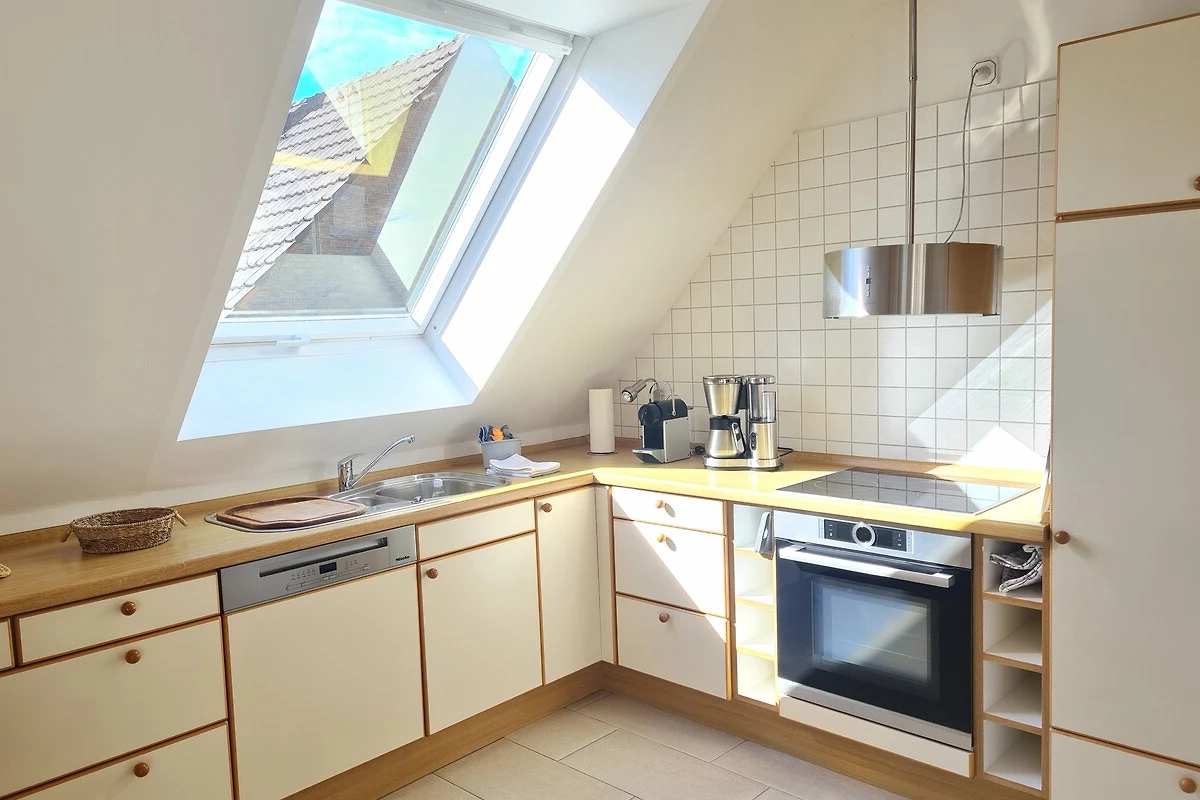 De vakantiewoning is uitgerust met een kitchenette die alle voorzieningen biedt voor een aangenaam verblijf. Een vaatwasser, magnetron en koffiezetapparaat zijn aanwezig zodat je gemakkelijk je maaltijden kunt bereiden. De keuken is uitgerust met meubilair van hoge kwaliteit en biedt veel opbergruimte.