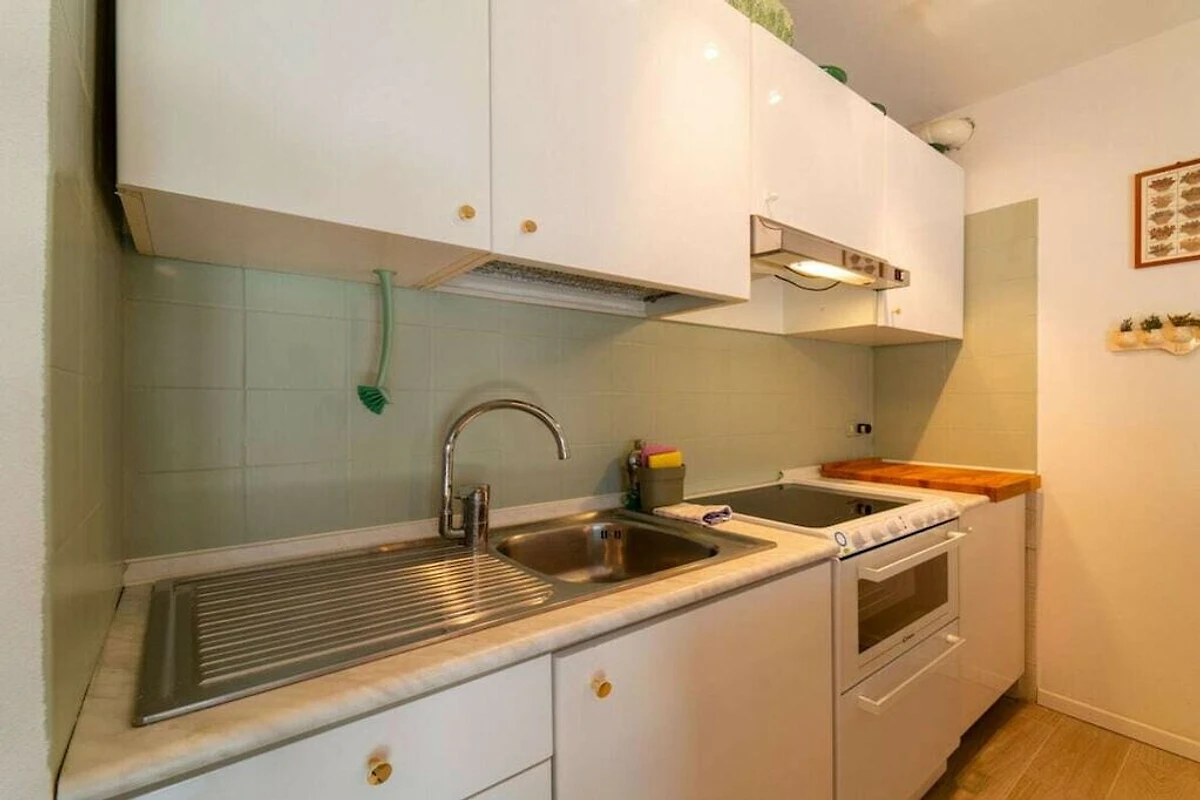 Het appartement, gelegen op de begane grond van een villa, is verdeeld over twee niveaus en komt uit op de grote woonkamer, voorzien van een comfortabele bank, televisie, eettafel en een open keuken met alle kookgerei, waaronder oven, waterkoker, fruitpers en broodrooster, is uitgerust. Vanaf hier komen de gasten in de tuin, die is uitgerust met een eethoek en een prachtig uitzicht biedt op het meer. Op de begane grond bevindt zich tevens een slaapkamer met een eenpersoonsbed en een badkamer met douche. Op de begane grond bevindt zich een taverne met een tweede woonkamer met banken en televisie, een slaapkamer met een tweepersoonsbed en een toilet.