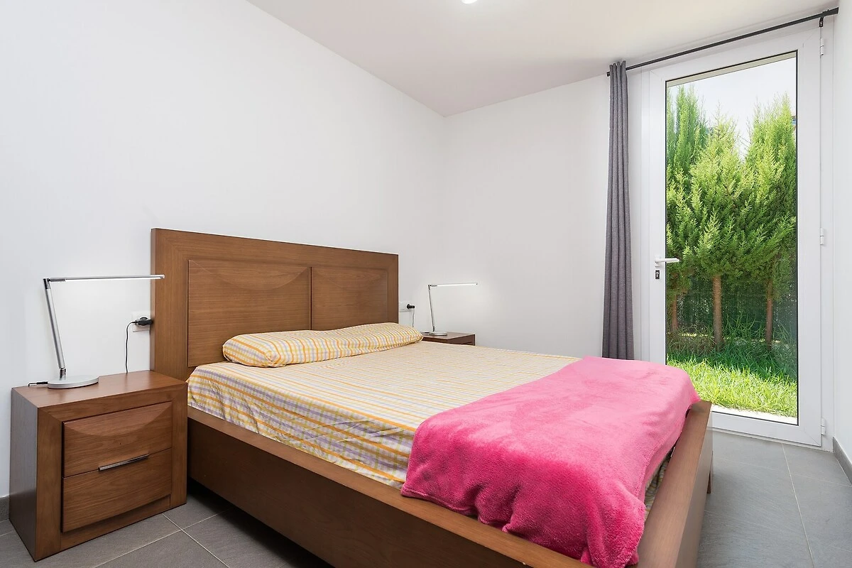 Deze charmante villa biedt een gezellig toevluchtsoord voor maximaal zes gasten, met drie goed ingerichte slaapkamers en twee badkamers. De slaapkamer op de begane grond, uitgerust met een tweepersoonsbed, biedt directe toegang tot de tuin, terwijl de twee slaapkamers op de bovenverdieping een ander tweepersoonsbed en een stapelbed hebben, waar zowel volwassenen als kinderen comfortabel kunnen verblijven. De woonkamer is ontworpen voor ontspanning, met airconditioning, een gezellige bank, een eettafel voor zes personen en een televisie met Spaanse en Duitse zenders, aangevuld met een open haard voor koelere avonden.