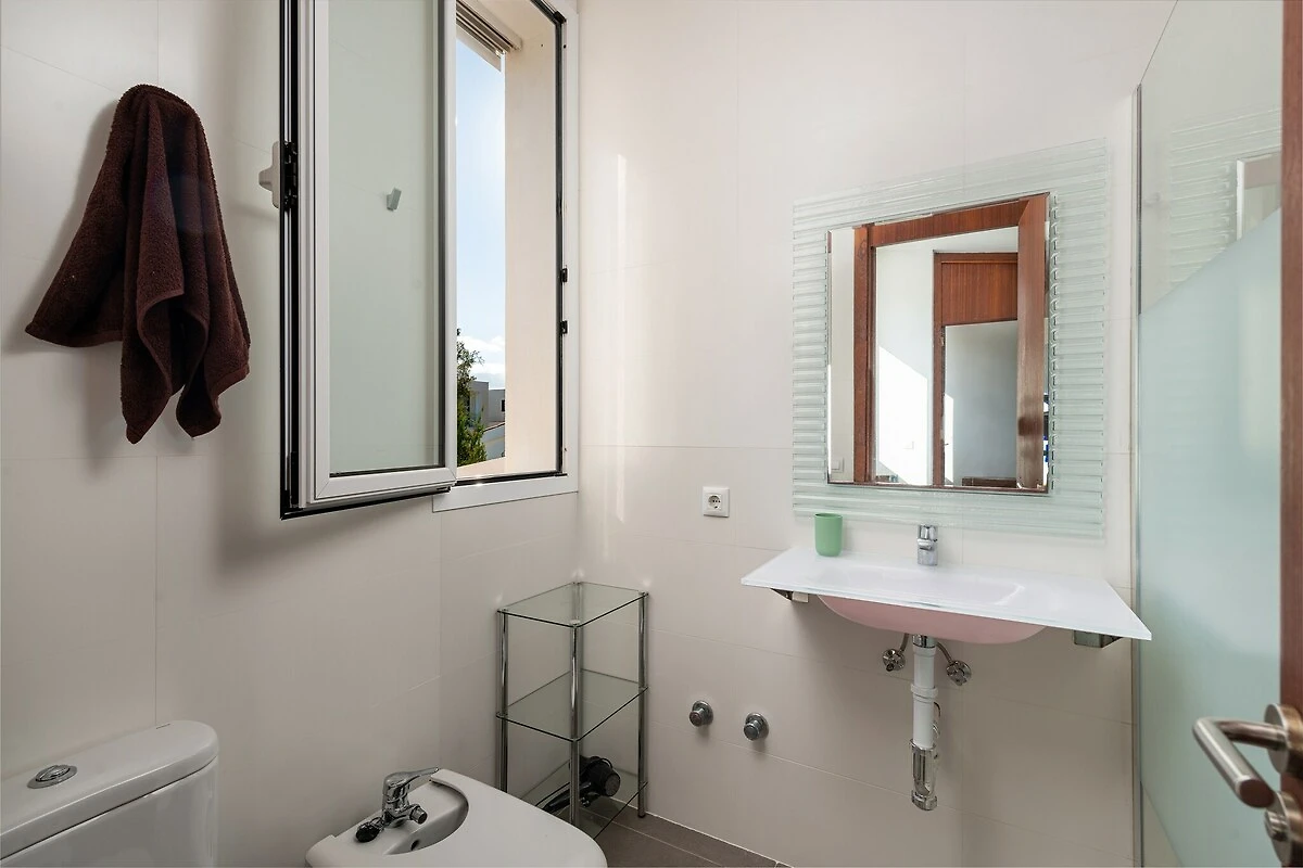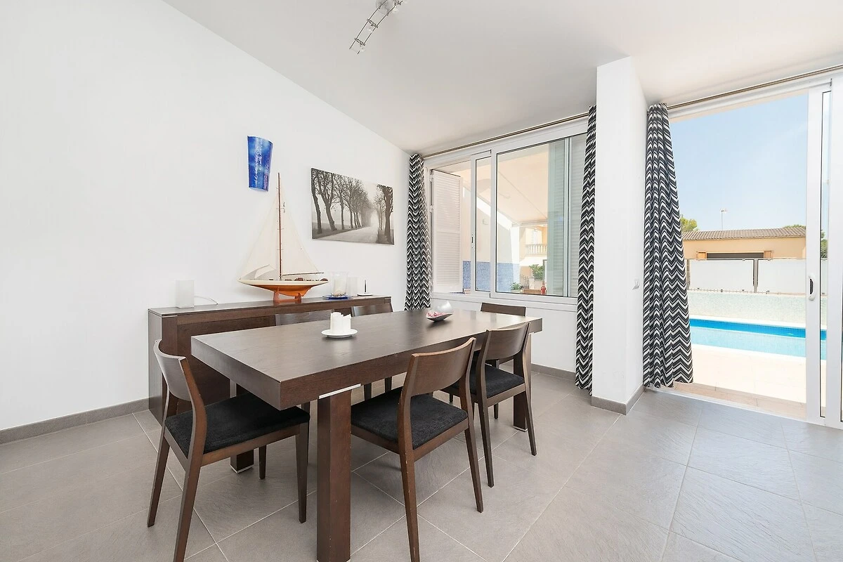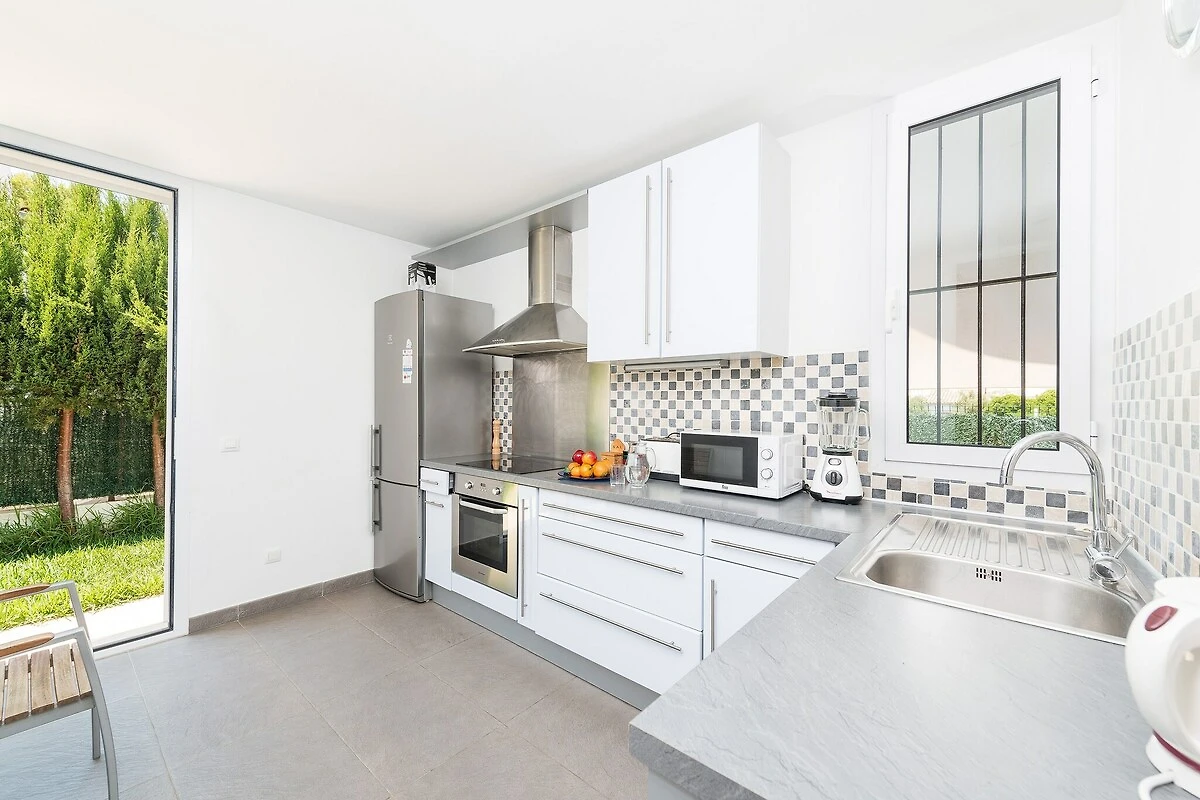 De aparte keuken is volledig uitgerust met alle essentiële apparaten voor een zorgeloos verblijf, waaronder een wasmachine, strijkijzer en strijkplank. Gasten zullen de twee badkamers waarderen, elk met een douche, die gemak bieden op beide verdiepingen van de villa. Gelegen in Son Serra de Marina, biedt de accommodatie een rustige omgeving, maar toch binnen handbereik van lokale voorzieningen en attracties.