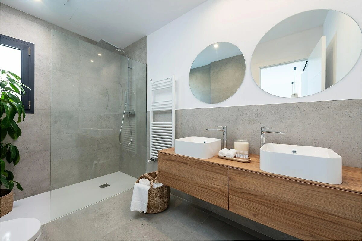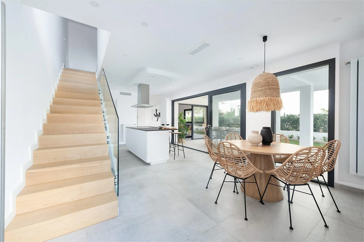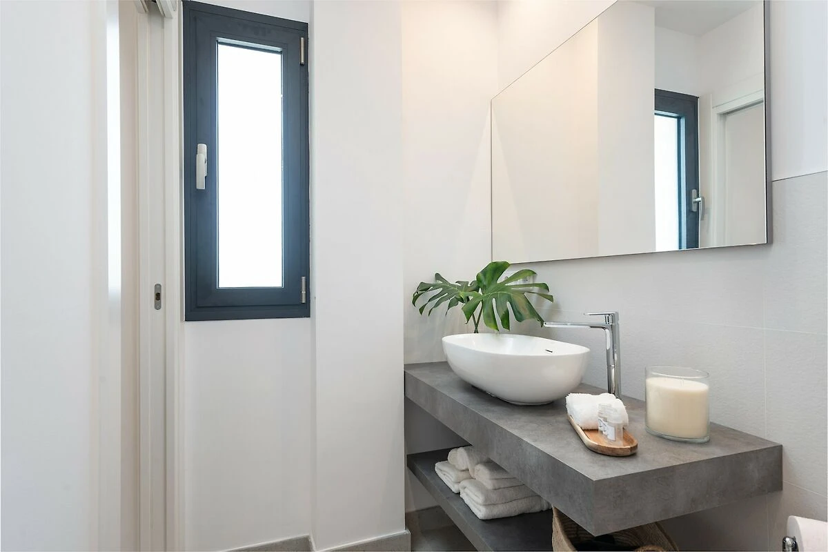 Het huis met twee verdiepingen is zorgvuldig ingericht voor een huiselijk gevoel. Vanaf de veranda komt u in de keuken-eetkamer, uitgerust met een inductiekookplaat, die leidt naar de ruime woonkamer met airconditioning en Smart TV. De begane grond heeft ook een wasruimte met een wasmachine, droger, strijkijzer en strijkplank, plus een handig toilet. Boven vindt u drie slaapkamers met eigen badkamer, allemaal met airconditioning. Twee slaapkamers hebben een tweepersoonsbed en de derde heeft twee eenpersoonsbedden. Centrale verwarming op gas zorgt voor comfort tijdens de koudere maanden. Het huis is ook uitgerust met een babybedje en een kinderstoel voor gezinnen.