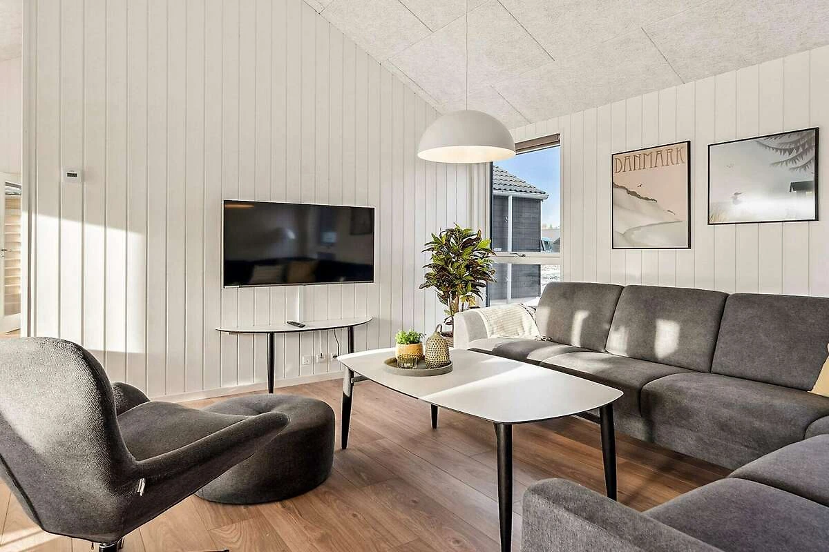 Unweit der tosenden Nordsee und der Urlaubsmetropole Henne und Blåvand liegt das gemütliche Ferienhausgebiet Houstrup Strand, wo dieses aktivitätsreiche Haus steht. Packen Sie die ganze Familie ein und verbringen Sie einen Sommerurlaub in diesem schönen Haus, das Aktivitäten und Unterhaltung für alle Altersgruppen bietet. Das Haus ist für 24 Personen ausgelegt, sodass Sie sich auf viele Stunden voller Spaß und Entspannung mit Ihren Lieben freuen können. Beginnen Sie Ihren Urlaub mit einem Sprung in den beheizten Pool und lassen Sie die Schwimmwettbewerbe beginnen. Wer schafft den größten Sprung von der Wasserrutsche? Wenn Ihr Körper nach einem harten Wettkampf etwas Entspannung braucht, können Sie diese im Außenwhirlpool und in der Sauna des Hauses finden. Hier haben Sie reichlich Gelegenheit, komplett abzuschalten und vom Stress und der Hektik des Alltags abzuschalten. Nachdem Sie im Außenwhirlpool neue Energie tanken konnten, können Sie die Wettkämpfe im großen Aktivitätsraum des Hauses fortsetzen. Hier können Sie eine Mini-Olympiade mit Aktivitäten wie Billard, Tischtennis und Tischfußball veranstalten. Während des Turniers können die übrigen Zuschauer von der Bar im Aktivitätsraum aus zusehen und Ihre Lieblingsgetränke genießen. Denken Sie nur an die Zutaten. Nach vielen Stunden Spielzeit meldet sich bestimmt der Hunger. In diesem modernen Haus von Skanlux ist die Wohnküche das Herzstück. Im Wohnzimmer befindet sich die große XL-Küche, in der Sie phänomenale Gerichte zubereiten können. Das exquisite Essen können die Gäste des Hauses am großen Esstisch genießen, an dem alle 24 Gäste Platz finden – das nennen wir Gemeinschaft. Bei schönem Wetter können Sie Ihre Mahlzeiten auch auf der großen Terrasse des Hauses genießen. Mit vollem Magen und Einbruch der Dunkelheit können Sie sich auf der Sofaecke des Wohnzimmers entspannen, fernsehen, Karten spielen oder einfach die Gesellschaft der anderen genießen. Das Haus verfügt über drei Schlafbereiche mit eigenen Bädern und insgesamt neun Schlafzimmer. Die restlichen 4 Schlafplätze befinden sich in den 2 Dachböden des Hauses, die bei Kindern und Jugendlichen sehr beliebt sind.