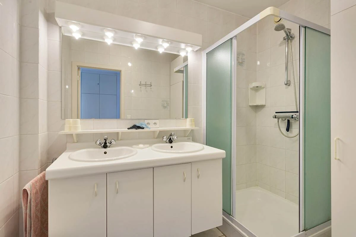 Het appartement beschikt over twee comfortabele slaapkamers, waarvan er één toegang biedt tot het terras aan de achterzijde. De badkamer is goed uitgerust met een dubbele wastafel en een inloopdouche, wat een moderne en handige opstelling biedt voor uw verblijf.