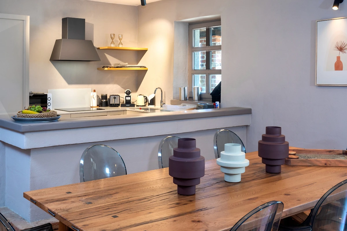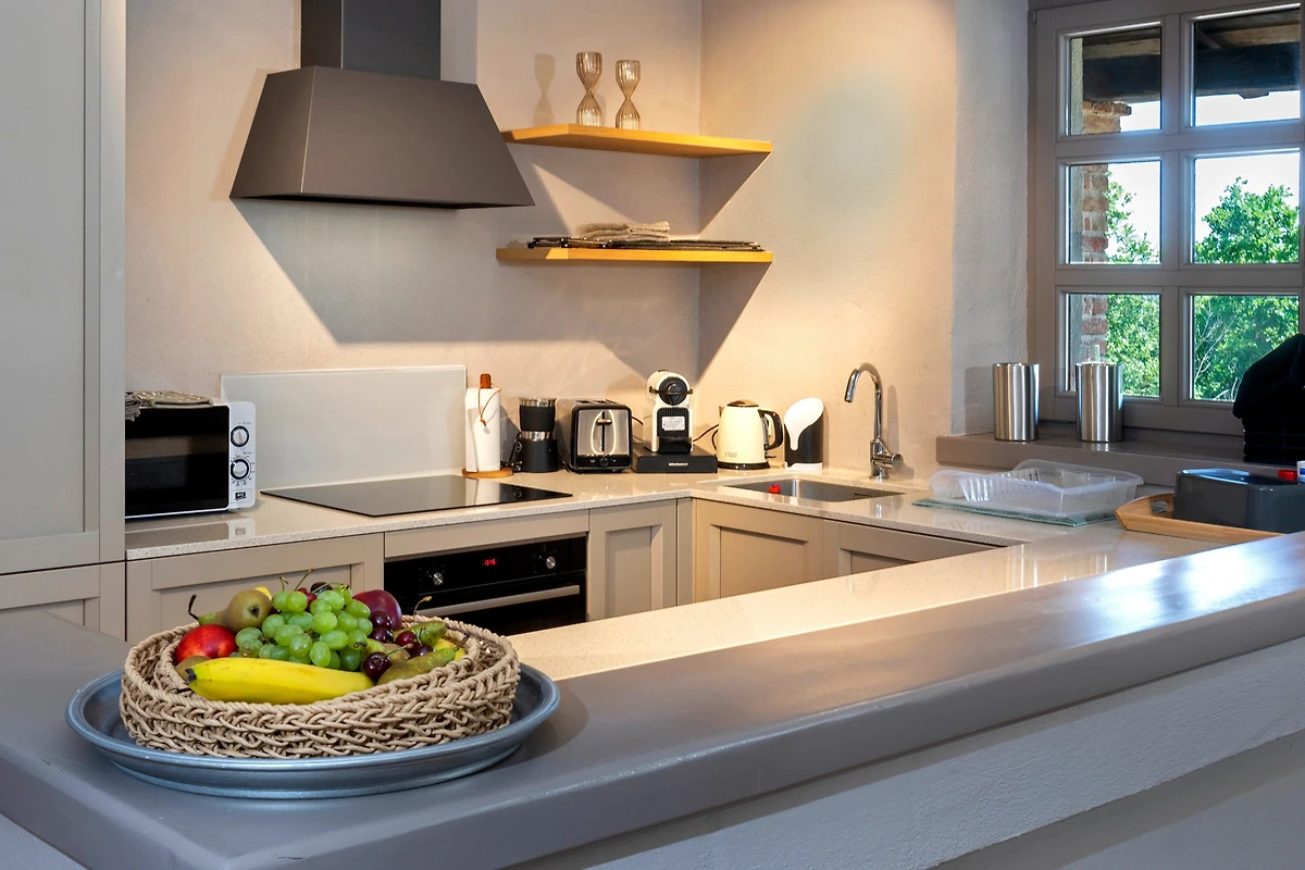 De open keuken, met inductie kookplaat, is uitgerust met koelkast, magnetron, oven, vriezer, vaatwasmachine, servies/bestek, keukengerei, koffiezetapparaat, broodrooster en waterkoker.