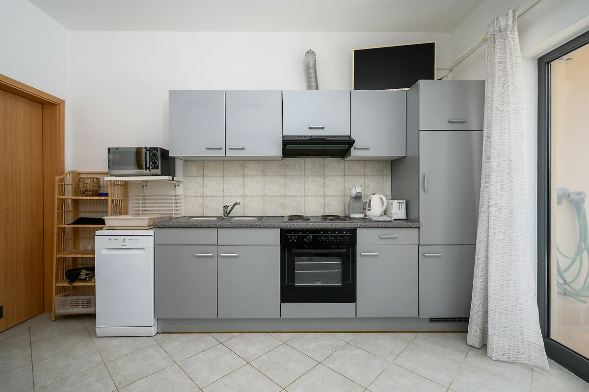 De open keuken, elektrisch fornuis, is uitgerust met koelkast, magnetron, oven, vriezer, vaatwasmachine, servies/bestek, keukengerei, koffiezetapparaat en waterkoker.
