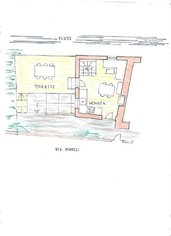 Vanaf de straat bereikt men via twee treden de woon- en eetkamer met keuken, waaraan het grote terras boven de rivier grenst.