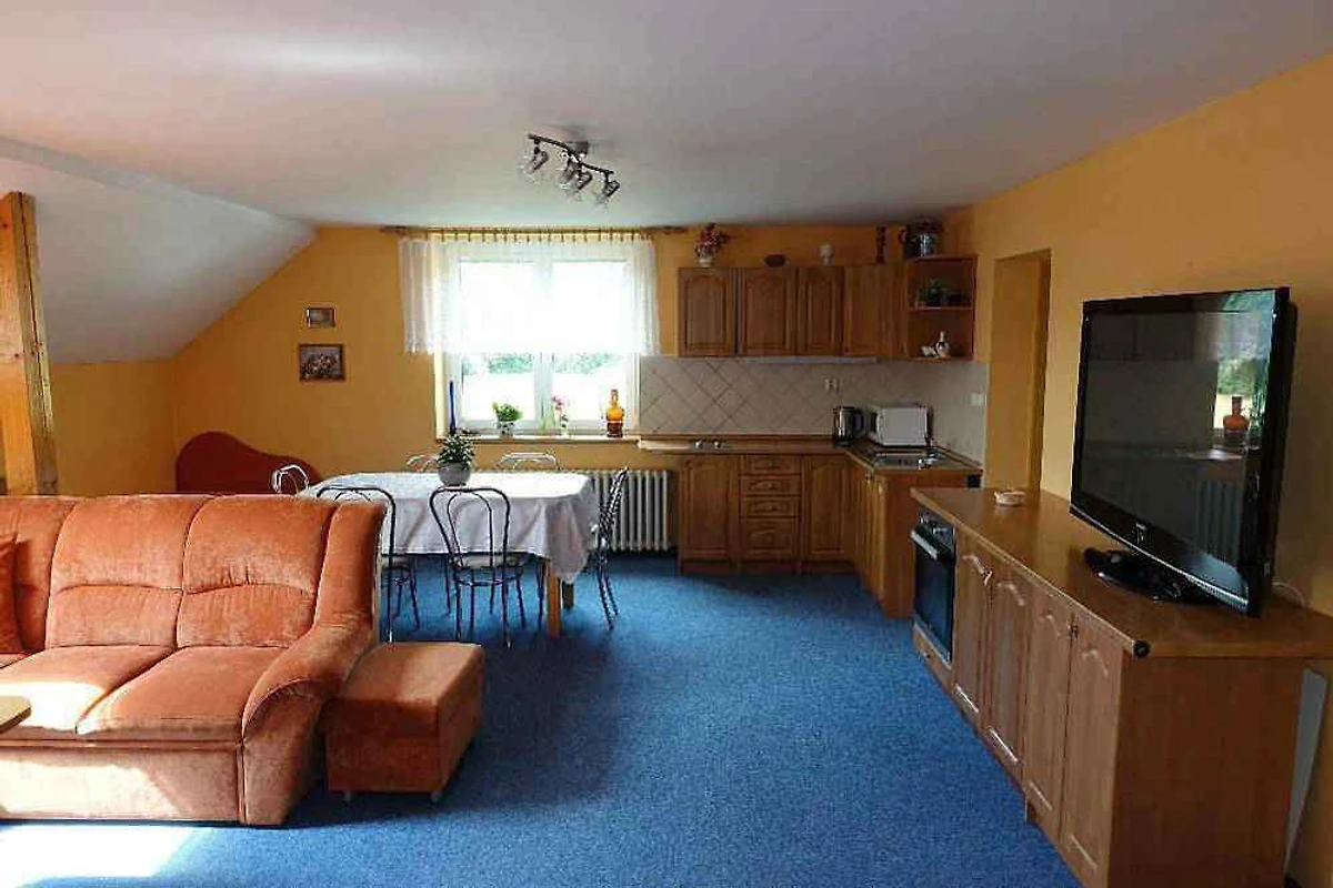 Ligging: Tanvald, 500 m boven de zeespiegel. De vakantiewoning ligt in een appartementenhuis en is modern en in lokale stijl ingericht. Het grondstuk is aan de rand van de plaats. Deze plaats is populair vanwege het ligt bij het water op een rustige, zonnige en afgescheiden plek. De toegangsweg naar het terrein gaat via een geasfalteerde hoofdweg. Bij het huis zijn U 3 parkeerplaatsen voor meerdere auto's op het perceel beschikbaar. De dichtsbijzijnde winkels zijn op 2,5 km afstand, restaurant 500 m en centrum 2,5 km.