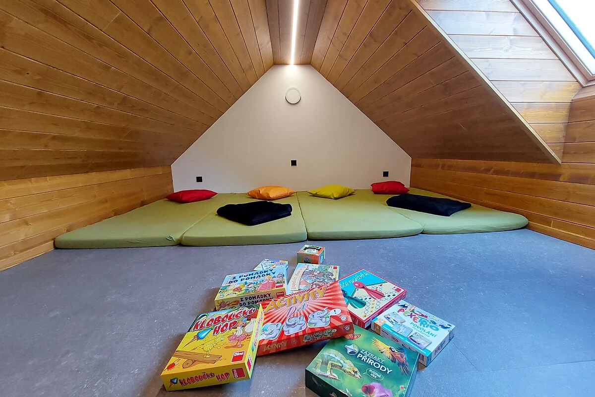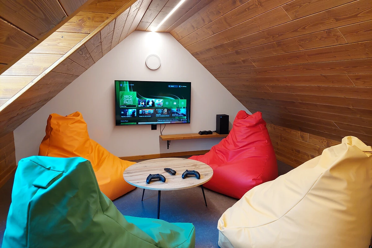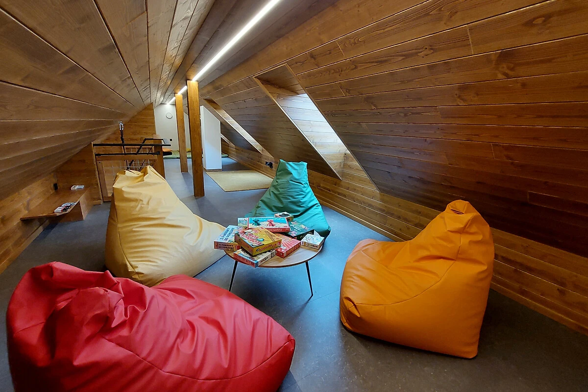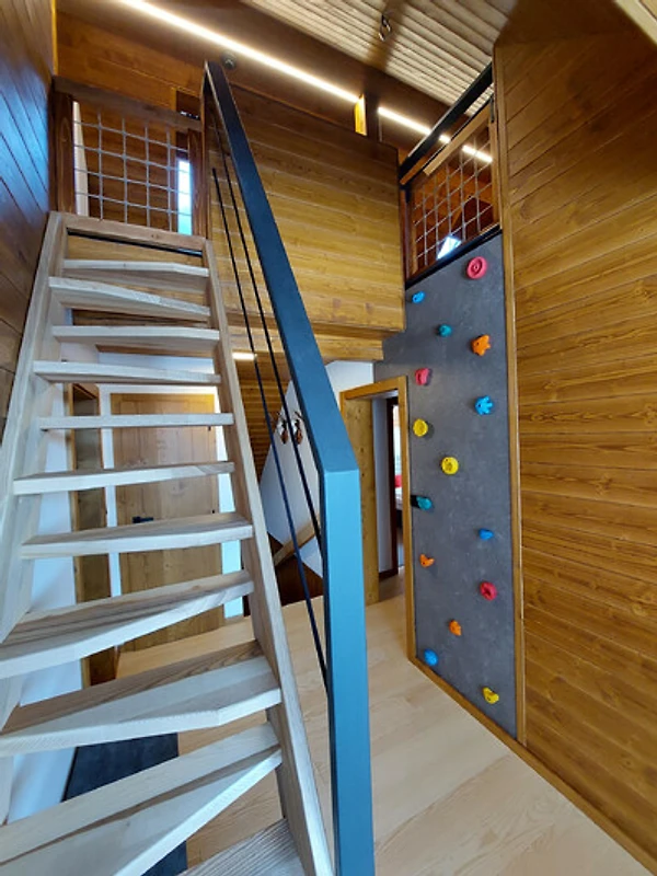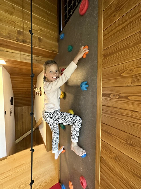 Binnen vind je vijf aparte slaapkamers en vier badkamers, waardoor iedereen privacy heeft. De woonkamer met open haard is het hart van het huis, perfect voor ontspannen avonden samen. De keuken is volledig uitgerust en geschikt om maaltijden voor een grote groep te bereiden. Boven is een speelkamer met zitzakken, TV en XBOX ONE X-gameconsole, maar ook bord- en kaartspellen voor wie het rustig aan wil doen. Kinderen kunnen via de trap of de klimwand naar de speelkamer.