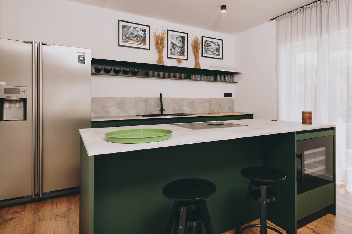 De open keuken, met inductie kookplaat, is uitgerust met koelkast, oven, vriezer, vaatwasmachine, servies/bestek, keukengerei, koffiezetapparaat en broodrooster.