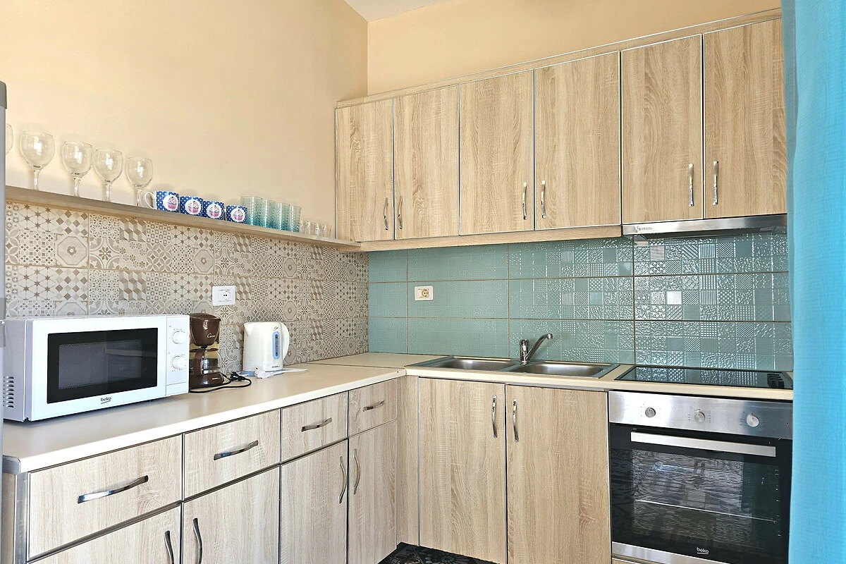De open keuken, met keramisch fornuis, is uitgerust met koelkast, oven, servies/bestek, keukengerei, broodrooster en waterkoker.