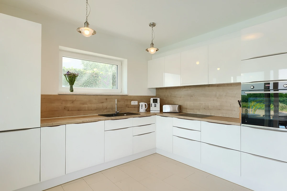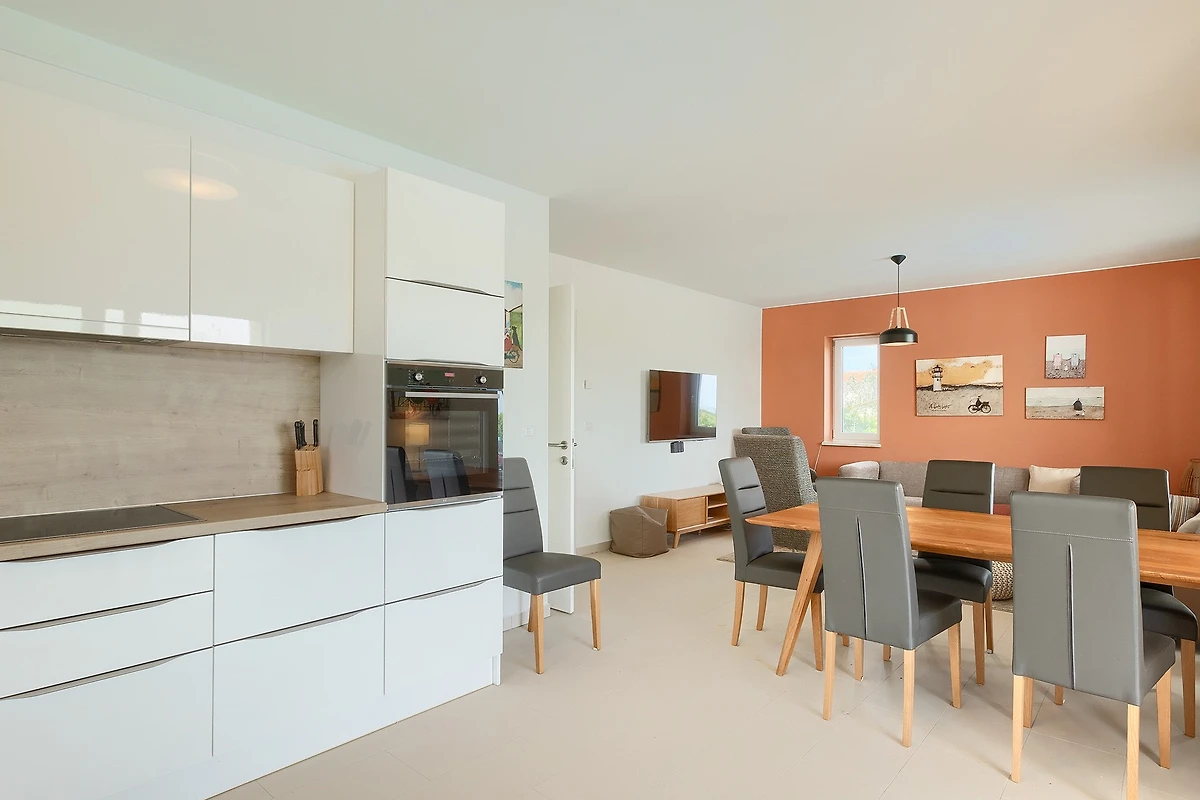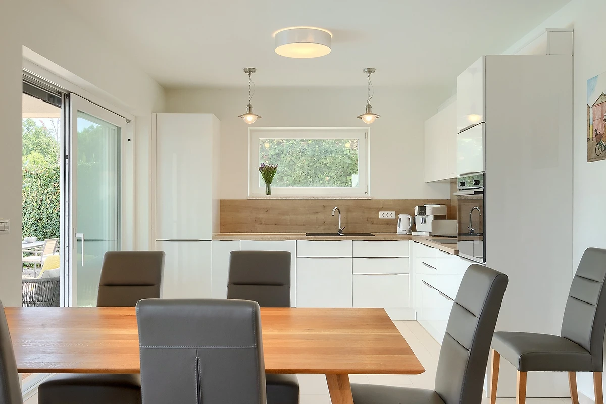 De open keuken, met inductie kookplaat, is uitgerust met koelkast, magnetron, oven, vriezer, vaatwasmachine, servies/bestek, keukengerei, koffiezetapparaat, broodrooster en waterkoker.