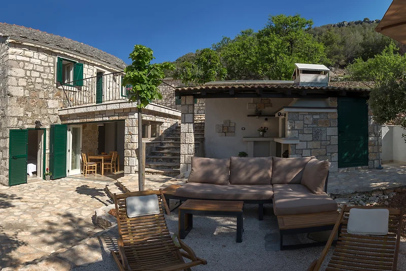 Op de bovenverdieping bevindt zich ook een ruim terras dat ook als ligbed kan worden gebruikt. Stenen trappen leiden naar het kiezelstrand en de kristalheldere zee. Op het strand is er ook een aanlegplaats. Het huis is ideaal voor mensen die van privacy houden en graag in de natuur zijn. De stilte in de vroege ochtenduren en 's nachts is nauwelijks in woorden te vatten, net als de nachtelijke hemel met ontelbare sterren. Een bijzondere ervaring zijn ook de nachten wanneer het maanlicht weerkaatst op het zeeoppervlak. Het is heel gewoon om dolfijnen en tonijnen te zien, zelfs tijdens de zomermaanden wanneer het drukker is op zee. Ook vissers zullen aan hun trekken komen