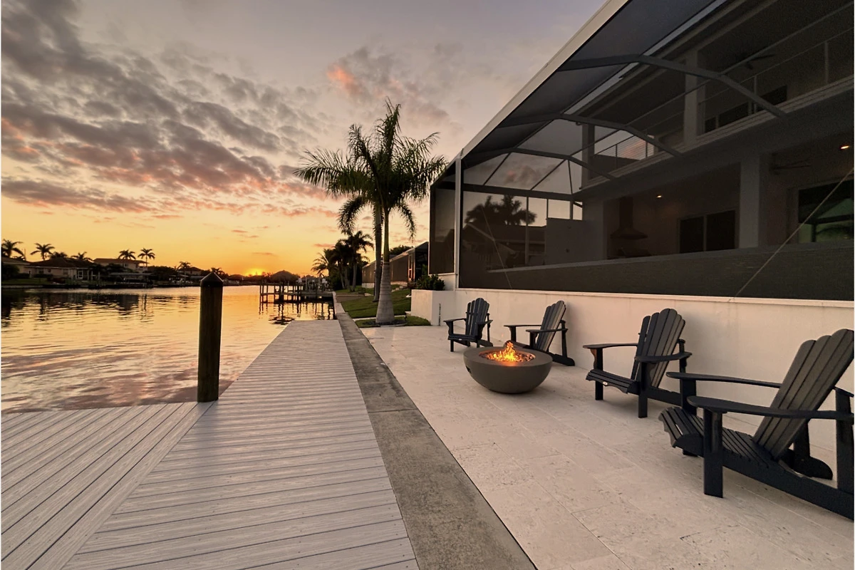 Deze nieuwbouwvilla is een designvilla met hoge eisen. Ze bevindt zich in een van de mooiste woonwijken in het zuidwesten van Cape Coral, met zuidelijke oriëntatie en uitzicht op een waterbassin. Een goede bootligging is een ander pluspunt. Vertrek direct vanaf de eigen bootsteiger met lift voor uw spannende uitstapjes. Met 360 m² woonoppervlak, verdeeld over twee verdiepingen, biedt de villa voldoende ruimte voor een droomvakantie! In totaal bevinden zich in deze villa van topklasse een grote woonkamer, vier slaapkamers, vier badkamers en voldoende ruimte ook voor twee of meer gezinnen. Door de vele binnen- en buitenruimtes vindt iedereen zijn eigen plek! Bij de bouw werden alleen hoogwaardige materialen gebruikt en ook bij de inrichting en decoratie werd het hoogwaardige design voortgezet. Het zwembadcomplex is uniek: het verwarmbare infinity-zoutwaterbad in prachtig design is een blikvanger met de waterlijn direct op pooldeckniveau. Het zwembad is groot genoeg om baantjes te trekken en de 360 graden overloop met turquoiseblauw water maakt het tot een bijzondere belevenis. Het aangrenzende, grote bubbelbad nodigt bovendien uit om te ontspannen. ’s Avonds zorgen vuurschalen voor een heel bijzondere en gezellige sfeer. Het royaal aangelegde terras met voldoende ligstoelen en loungemeubels biedt veel ruimte om te ontspannen en samen te eten aan de eettafel. Door de zuidwestelijke ligging van het zwembad kunt u lang van de zon genieten. Daarnaast staat er een buitenkeuken met BBQ-grill tot uw beschikking. Ook vanaf het balkon op de eerste verdieping heeft u een mooi uitzicht en gegarandeerd prachtige zonsondergangen!
