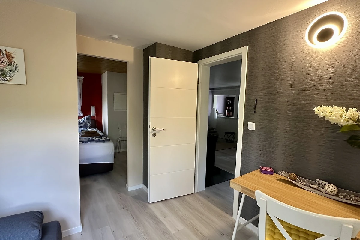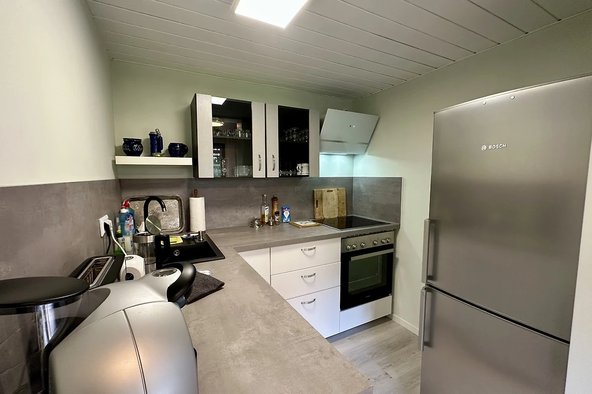 Het woongedeelte is uitgerust met stijlvolle meubels, een comfortabele sofa en een flatscreen-tv, ideaal om te ontspannen na een dag vol belevenissen. De keuken is modern ontworpen en uitgerust met alle noodzakelijke apparatuur, waaronder een vaatwasser, een waterkoker en een koffiezetapparaat die niets te wensen overlaten. Geniet van uw zelfbereide maaltijden aan de elegante eettafel of ontspan met een kopje koffie.