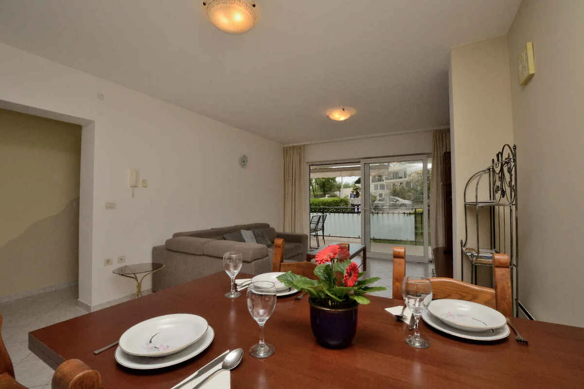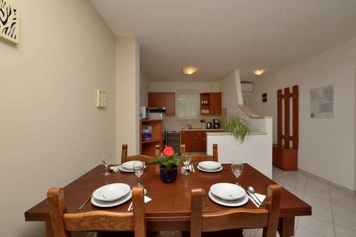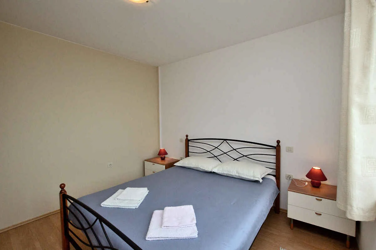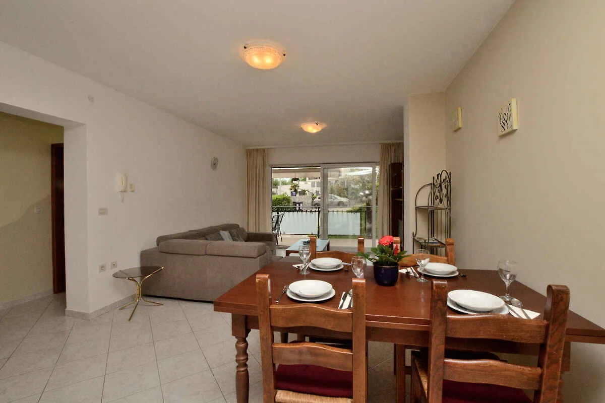 Uw vakantiewoning: Uw vakantiewoning beslaat 1 verdieping, 3 kamers (daarvan 2 slaapkamers), is 70 m² groot en is geschikt voor maximaal 5 personen. Een airconditioning zorgt op hete dagen voor een aangename temperatuur. Op koude dagen kan uw vakantiewoning verwarmd worden met een elektrische verwarming. De indeling van de kamers is als volgt: woonkamer met zithoek, eethoek en TV. De eethoek heeft plaats voor 5 personen. slaapkamer 13 m² groot en met 2 éénpersoonsbedden. slaapkamer 14 m² groot en met 1 tweepersoonsbed en 1 éénpersoonsbed. U heeft toegang tot het balkon. kookhoek in de woonkamer met afwasmachine, gasfornuis (4 pitten), bakoven, koelkast, magnetron, koffiemachine, broodrooster en elektrische waterkoker. badkamer met douche, WC en venster.
