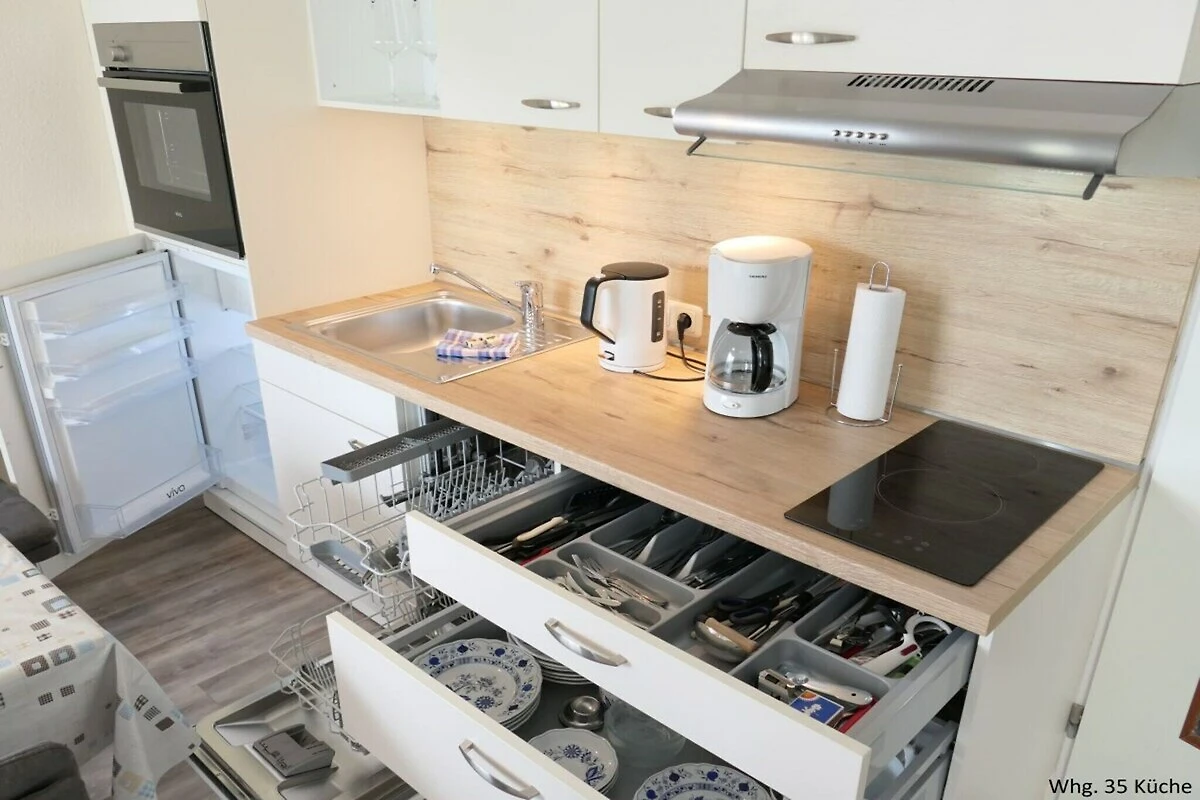 Parterre: (hal, keuken(oven, afwasmachine, koelkast, ), woon/eetkamer(1-pers. slaapbank, TV, eettafel), badkamer(douche, wastafel, toilet, ))