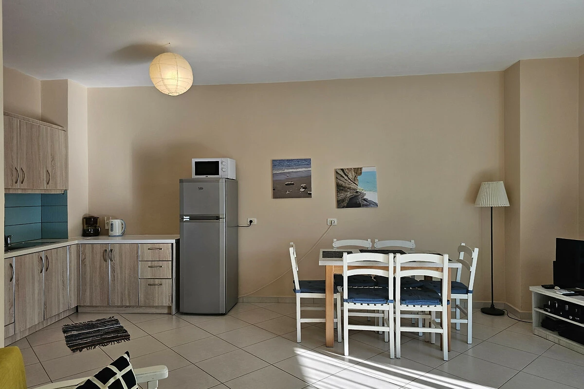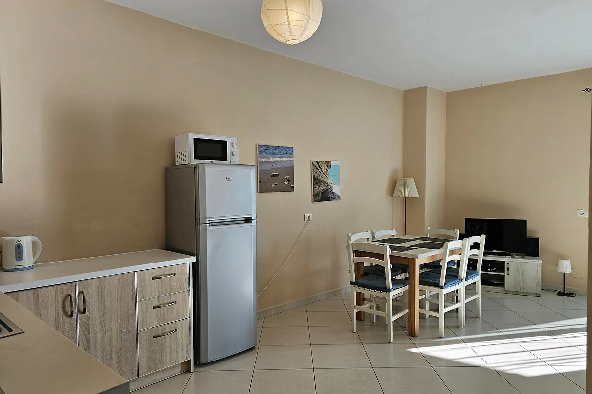 De open keuken, met keramisch fornuis, is uitgerust met koelkast, oven, keukengerei, broodrooster en waterkoker.
