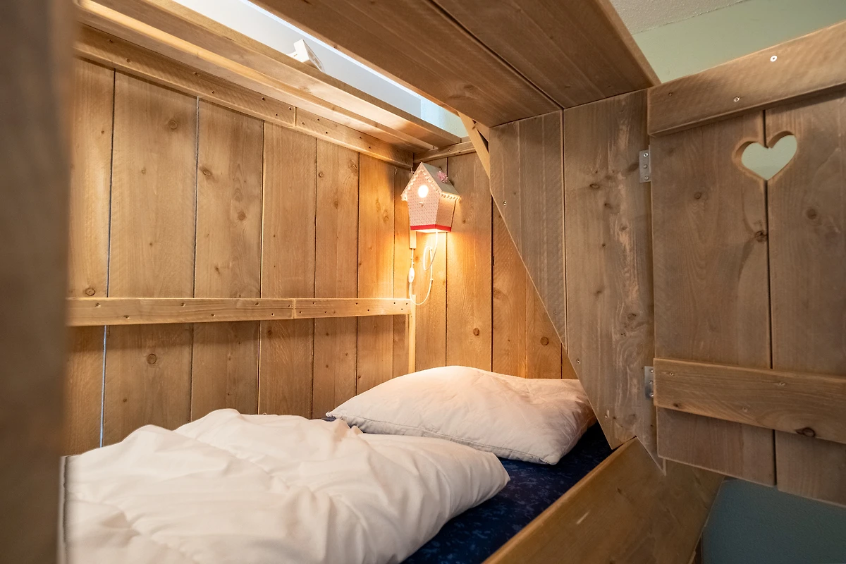 Voor de kids is er een ware droom: een houten bedstee met stapelbed – perfect om in te spelen én lekker in te slapen!