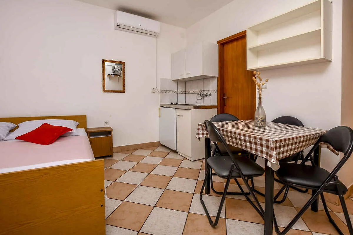 Uw vakantiewoning: Uw vakantiewoning beslaat 1 verdieping, 1 kamers, is 17 m² groot en is geschikt voor maximaal 2 personen. Een airconditioning zorgt op hete dagen voor een aangename temperatuur. De indeling van de kamers is als volgt: woon/slaapkamer met 1 tweepersoonsbed, zithoek, eethoek en TV. De eethoek heeft plaats voor 2 personen. kookhoek in de woonkamer met elektrisch fornuis (2 kookplaat), koelkast (vriesvak), koffiemachine en elektrische waterkoker. badkamer met douche, WC en venster.