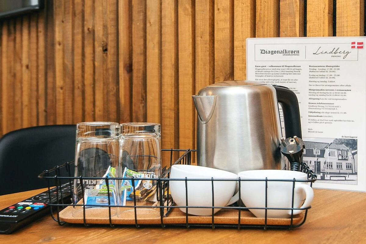 Diagonalkroen ist ein charmantes Gasthaus am Torvet 1 im Herzen von Give. Mit seinen 14 neu eingerichteten Zimmern bietet der Gasthof ein authentisches und modernes Erlebnis für seine Gäste. Jedes Zimmer ist mit dem Schwerpunkt auf Komfort und Gemütlichkeit eingerichtet, um einen erholsamen Aufenthalt zu gewährleisten. Im Restaurant des Gasthofs, das von Lindberg Dining betrieben wird, können die Gäste eine abwechslungsreiche Speisekarte genießen, die von klassischen Kronengerichten wie Wienerschnitzel und gebratener Scholle bis zu köstlichen Steakhouse-Spezialitäten reicht. Der Küchenchef sorgt auch für schmackhafte Gerichte für die kleinen Gäste. Nach dem Essen können Sie sich in der gemütlichen Bar entspannen, wo eine Auswahl an Getränken in entspannter Atmosphäre serviert wird. Für Golfliebhaber ist Diagonalkroen ideal gelegen, da mehrere Golfplätze leicht zu erreichen sind, darunter der Give Golf Club, der nur 3 km entfernt ist. Die zentrale Lage des Gasthofs macht es auch einfach, die nahe gelegenen Städte wie Herning, Billund und Vejle zu erkunden. Ganz gleich, ob Sie ein romantisches Wochenende, einen Golfausflug mit Freunden oder einen Familienurlaub planen, Diagonalkroen bietet Ihnen ein unvergessliches Erlebnis, bei dem Gastfreundschaft, Komfort und kulinarische Genüsse im Mittelpunkt stehen.A refundable deposit might be charged closer to your check-in date. The security deposit ensures a smooth stay and covers any additional services or consumption charges.This deposit covers utilities consumed during your stay and any additional services that may be taken.The final amount will be adjusted based on actual meter readings, actual usage of extra services, and any remaining balance will be refunded within 21 days after checkout.This deposit simply acts as a prepayment for charges that you would anyways pay for, ensuring a seamless stay and check-out experience.