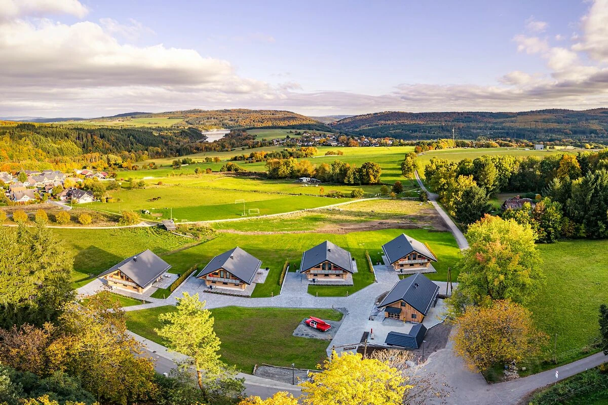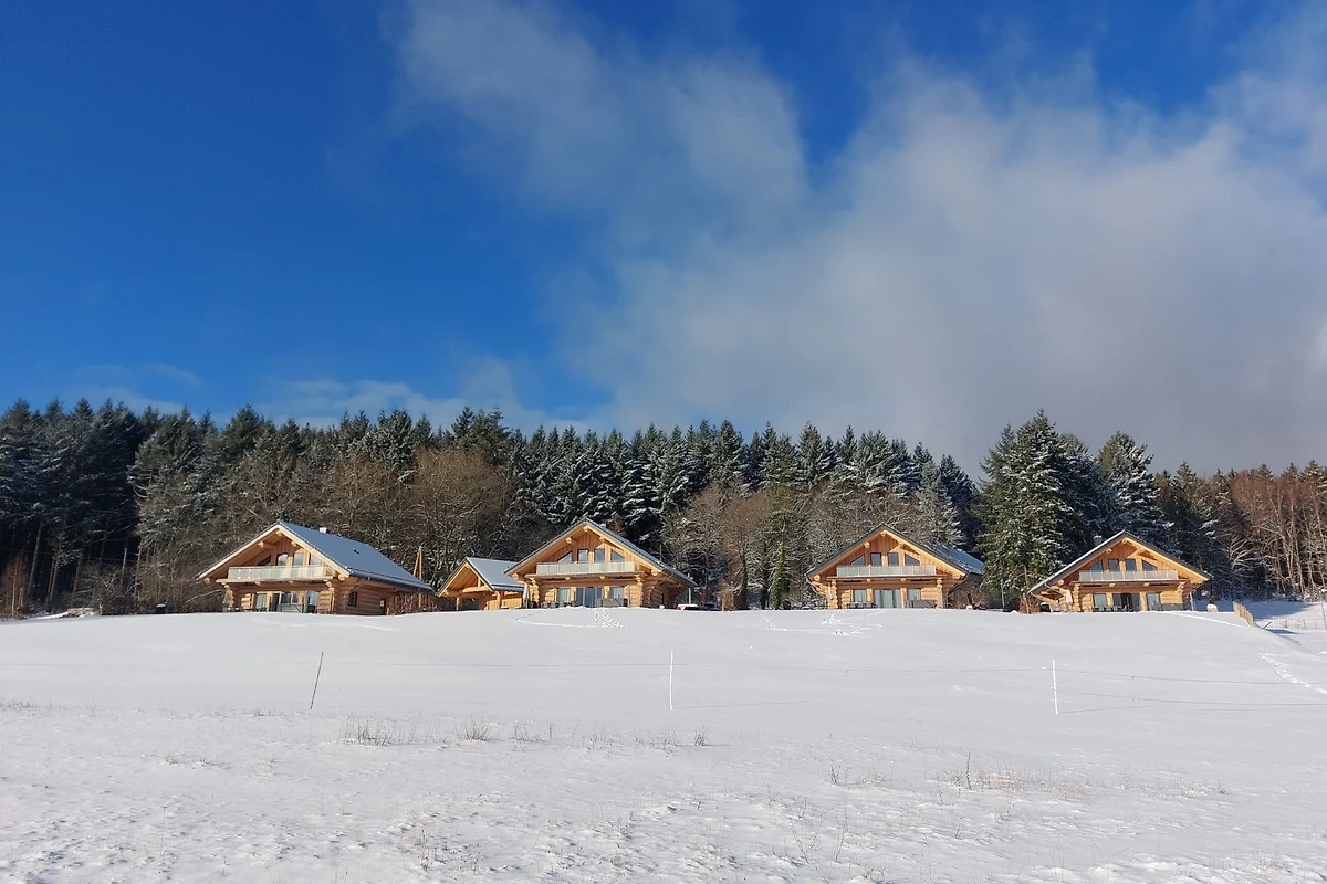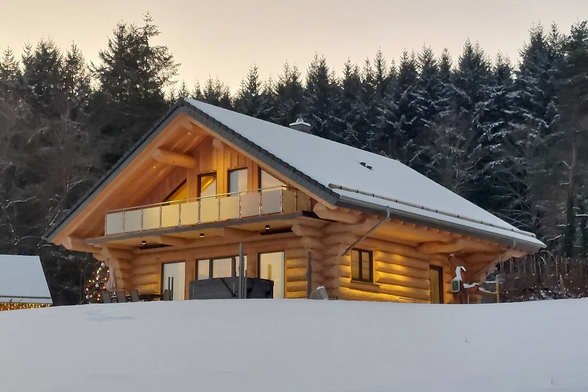 De vier chalets bevinden zich op een perceel van ca. 12.000 m². Op twee woonlagen bevinden zich drie slaapkamers, een badkamer met sauna, een gasten-wc, een grote open woon-eet-keukenruimte en een bibliotheek. De chalets hebben op de zolderverdieping twee balkons met elk 15 m² balkonoppervlak. U kunt dus vanuit de slaapkamer direct naar buiten het balkon op gaan en naar het bos kijken, vanaf het balkon aan de voorkant kunt u in Canadese relaxstoelen direct op het meer uitkijken. Op het grote terras bevindt zich bij elk huis een Hotspring Premium-whirlpool en een Weber-houtskoolgrill. De bedden zijn uitgerust met hoogwaardige, rugvriendelijke boxspringmatrassen die voorzien zijn van een hygiënische matrashoes. Alle bedden zijn bij aankomst opgemaakt met fris beddengoed. Als extra slaapmogelijkheid kan de hoogwaardige slaapbank in de bibliotheek voor twee extra personen worden gebruikt. Onze vier gloednieuwe natuurstam-chalets zijn in hun bouwstijl uitzonderlijk en exclusief met veel aandacht voor detail ingericht. Ze liggen op een unieke locatie, direct aan de bosrand, met een weids uitzicht op de ongerepte natuur van de Hunsrück, het Nationaal Park en het Steinbachmeer. Stel u voor hoe uw vakantie begint: u opent de deur van uw chalet, ademt de frisse, aangename lucht in, de licht zoete geur van het hout, en laat u betoveren door de warme sfeer en de gezellige architectuur van uw Canadese blokhut. Door de panoramavensters kijkt u uit op de indrukwekkende natuur – ofwel vanaf het terras of comfortabel in de oorfauteuil. Misschien geniet u daarbij van een vers geroosterde koffie of een glas sekt, terwijl u het moment volledig beleeft.