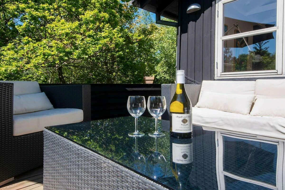 keuken(fornuis(elektrisch), koffiezetapparaat, magnetron, koelkast), woon/slaapkamer(TV, chromecast), slaapkamer(2-pers. bed), slaapkamer(2x 1-pers. bed), badkamer(wasbak, douche, toilet), veranda, balkon, verwarming(elektrisch), terras, tuinmeubilair, lucht-lucht warmtepomp