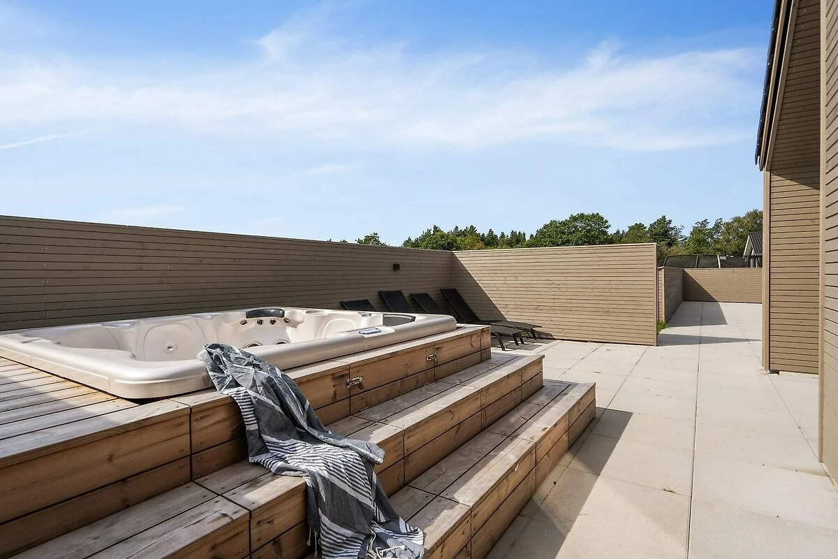 Schönes Ferienhaus mit Pool, Außen-Whirlpool und Sauna! In diesem wunderschönen, luxuriösen Ferienhaus für max. 16 Personen am Houstrup Strand können Sie Ihren Urlaub mit der ganzen Familie genießen. Neben der attraktiven Lage, unweit der Nordseeküste sowie der Ferienorte Blåvand und Henne Strand, bietet dieses Ferienhaus zahlreiche Freizeitaktivitäten sowohl außerhalb als auch innerhalb des Grundstücks. Im hauseigenen Poolbereich ist Ihnen zu jeder Jahreszeit ein Badevergnügen garantiert. Der Salzwasserpool des Ferienhauses ist mit einer römischen Treppe, einem Schwimmtrainer und einer Wasserrutsche ausgestattet. Das Wellness-Gefühl setzt sich im Außenbereich fort, wo Sie sowohl ein schönes Außen-Whirlpool als auch eine Außen-Sauna vorfinden. Im wunderschönen Aktivitätsraum stehen viele unterhaltsame Stunden bevor, wenn die ganze Familie gegeneinander antritt. Hier stehen Billard, Tischtennis, Tischfußball und Darts zur Auswahl. Wer lieber zuschaut, kann an der gemütlichen Bartheke des Raumes Platz nehmen und eine kühle Erfrischung genießen. Außerdem finden Sie eine gemütliche Fernsehecke, in der Sie bei einem guten Film entspannen können. In der Mitte des Hauses finden Sie u.a. die gut ausgestattete Wohnküche mit viel Platz für das gemeinsame Kochen – und auch einen Weinkühlschrank für Ihre mitgebrachten Flaschen und auch einen Weinkühlschrank für Ihre mitgebrachten Flaschen. Zum Abendessen kann die ganze Familie am langen Esstisch vor der Küche Platz nehmen, von dem aus man einen direkten Blick in den Billardraum hat. An kühlen Tagen können Sie den Holzofen im Wohnzimmer anheizen und es sich mit einem Brettspiel oder einem guten Buch in der Sofaecke gemütlich machen. Auch im Außenbereich gibt es viel Platz zum Entspannen und Spielen, und zwar auf der teilweise überdachten Terrasse, die neben einem Außen-Spa und einer Außensauna auch über Gartenmöbel und einen Grill verfügt. Während das Essen auf dem Grill zubereitet wird, können die Kinder im Garten spielen, wo es ein Bodentrampolin und einen Spielturm mit Schaukeln gibt. Das geräumige Ferienhaus verfügt über 2 Schlafzimmer mit zugehörigem Badezimmer. Insgesamt stehen 6 Schlafzimmer bereit. Zusätzlich gibt es 4 Schlafplätze oben auf dem Hems im Dachgeschoss, welche besonders bei Kindern und Jugendlichen beliebt sind. Keine Jugendgruppen erwünscht. Es gibt einen Weinkühler im Haus.