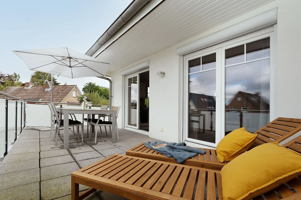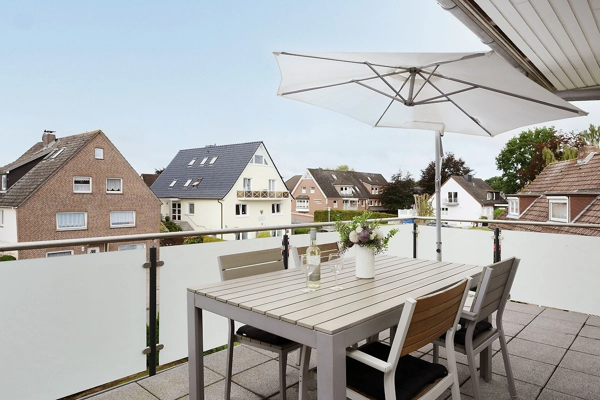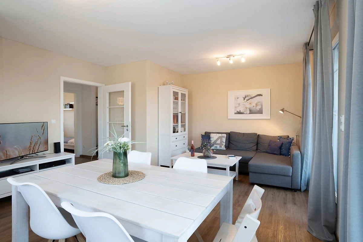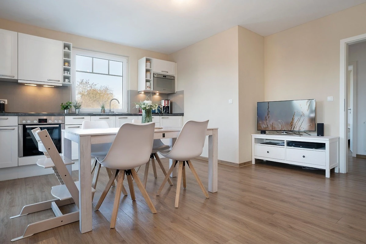 Schöne modern eingerichtete Wohnung. TV im Wohnzimmer, Schlafzimmer und Kinderzimmer. Großer Balkon mit Sonnenschirm und Strandkorb.