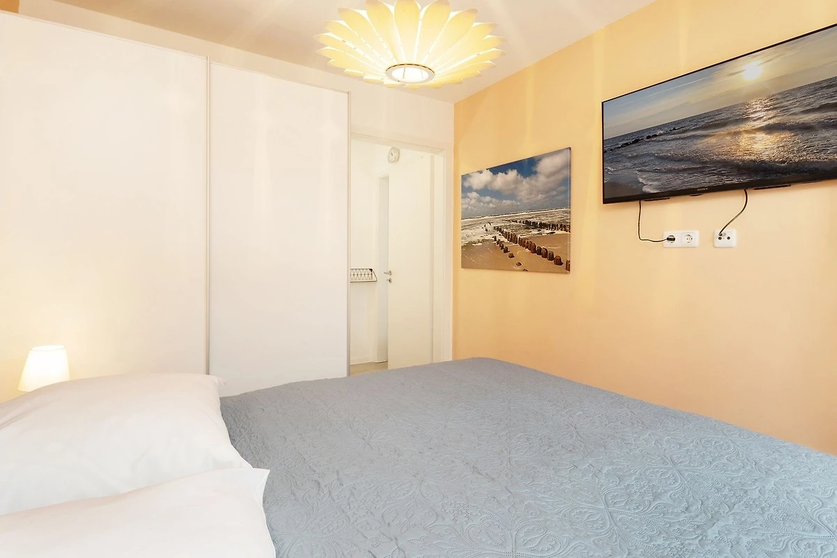 Die Wohnung liegt sehr nah zur Promenade und zur Einkaufsstraße. Das Haus ist neu und sehr hochwertig und es ist ruhig. Das Bad, die Fenster mit elektrischen Rollläden und die Böden sind super, die Möbel leider nicht. Das Bett knarzt bei jedem umdrehen und die Matratzen sind steinhart. Die Möbel sind sehr einfach.
