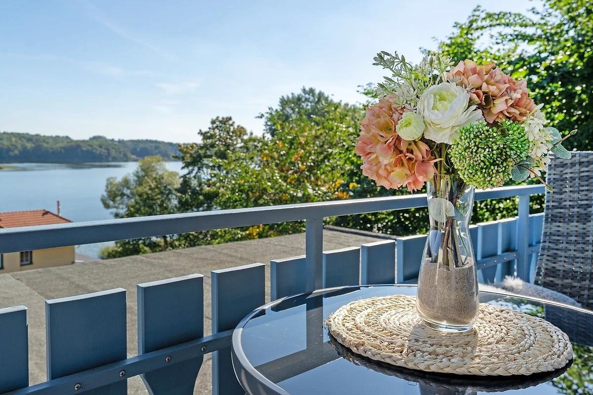 Die Wohnung Traumblick trägt ihren Namen zu Recht. Der Blick wird hin und wieder getrübt durch die zeitweilig stark befahrene Landstraße zwischen Eutin und Malente, die unterhalb des Hauses zwischen dem Hang und dem See verläuft. Die Wohnung ist gut ausgestattet und geschmackvoll eingerichtet.