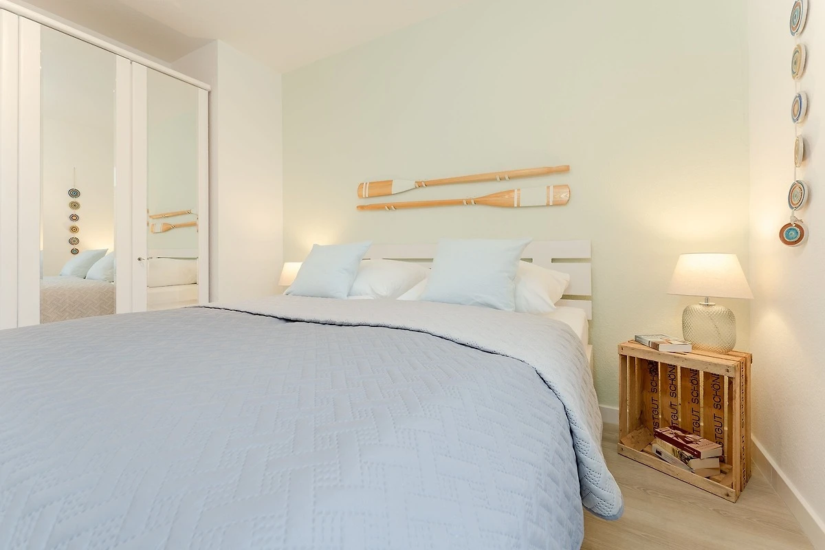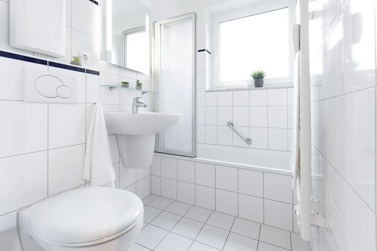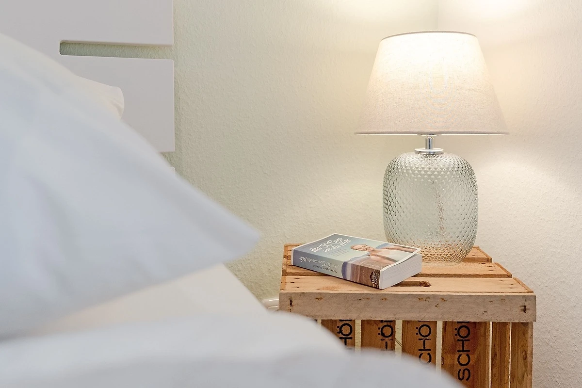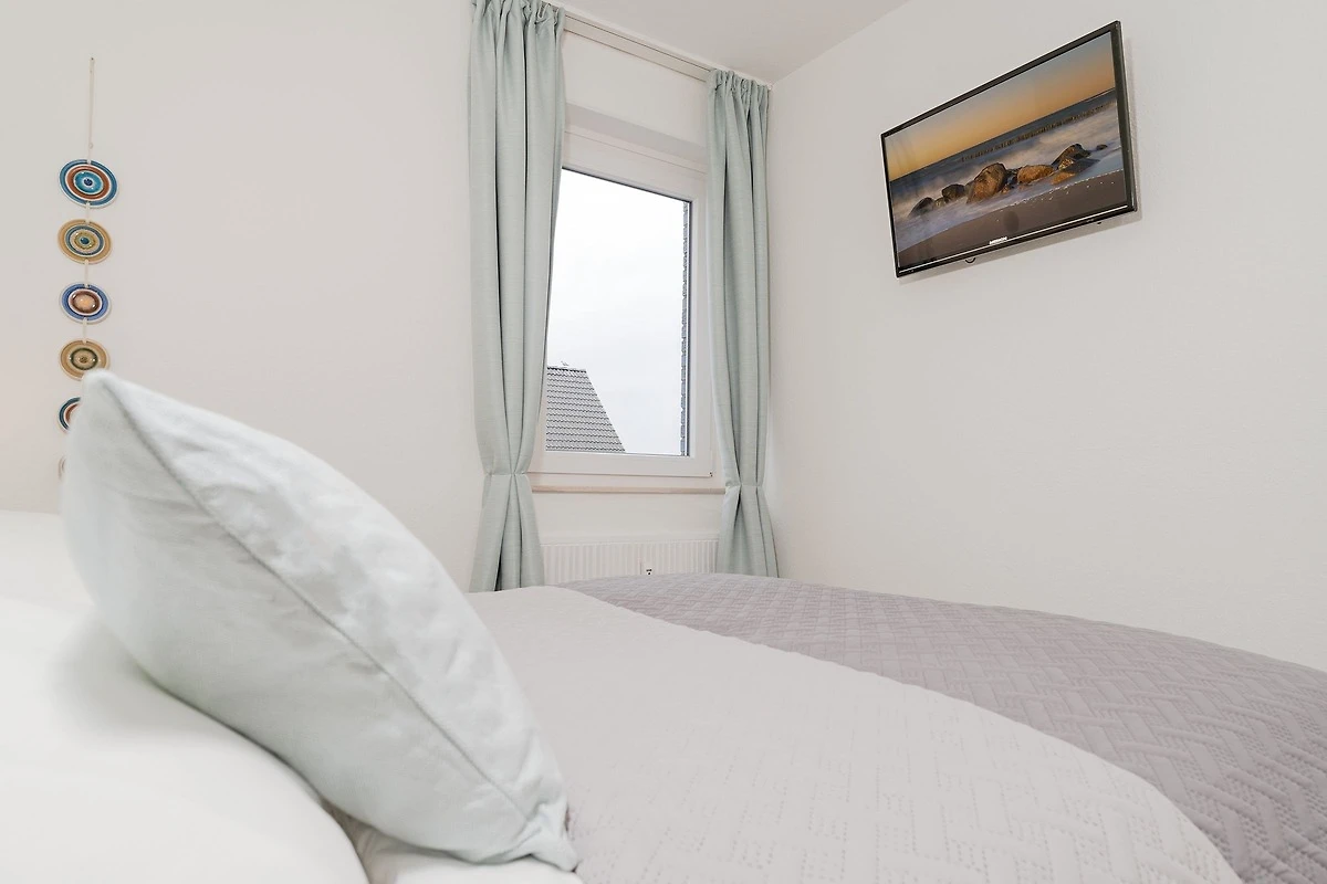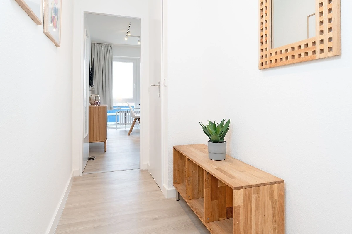 Die Wohnung war bei Ankunft sehr sauber. Die Einteilung der Räume ist sehr gut. Da die Wohnung in der 3.Etage (ohne Fahrstuhl), also ganz oben liegt, gibt es keine Wohnung darüber und im Übrigen nur eine Wand zur Nachbarwohnung, die ebenfalls eine Ferienwohnung ist. Zu dieser Wohnung ist es aber etwas hellhörig. Die Fensterfront (Balkonfenster) im Wohnzimmer sind mit elektrischen Rollos versehen und so kann man nachts komplett abdunkeln. Im Schafzimmer sind leider nur Verdunkelungsvorhänge. Das Gästebett im Wohnzimmer ist aber sehr gut und auch dort kann man schlafen. Die Lage der Wohnung ist top. Man ist sehr schnell an der Strandpromenade. Die Bäckerei Junge ist keine 5 Minuten zu Fuß entfernt und wenn man online bestellt und bezahlt, geht man Früh ganz entspannt an der Schlange vorbei zur Abholstation und muss nicht anstehen. Der Tiefgaragenstellplatz ist riesig und sicher. Man kann die Tiefgarage nur mit dem Schlüssel betreten. Vermisst haben wir eine Dusche, denn das Abduschen in der kleinen Badewanne ist etwas umständlich. Die Duschwand müsste mal getauscht werden. Auch der Toilettendeckel hatte seine beste Zeit gehabt und dürfte gerne einmal getauscht werden. Endlich mal eine Ferienwohnung, in der genug Handtuchhaken vorhanden waren ... jetzt müssten die Handtücher vom gebuchten Wäschepaket nur noch eine Schlaufe zum Aufhängen haben. Im Wohnzimmer hätten wir lieber eine Kommode gehabt als dieses eher unpraktische und mit Gläsern vollgestellte Schiebetürenschränckchen. Aber das ist Meckern auf hohem Niveau. Leider gab es in der Küche keine großen Essteller. Ansonsten war im Wesentlichen alles vorhanden.