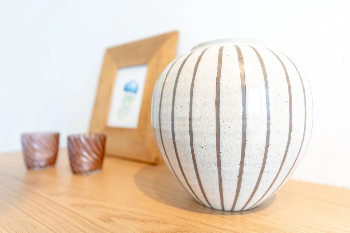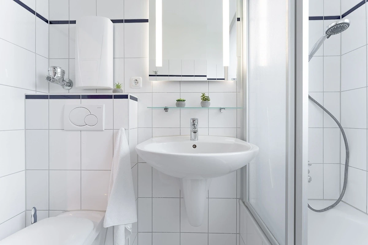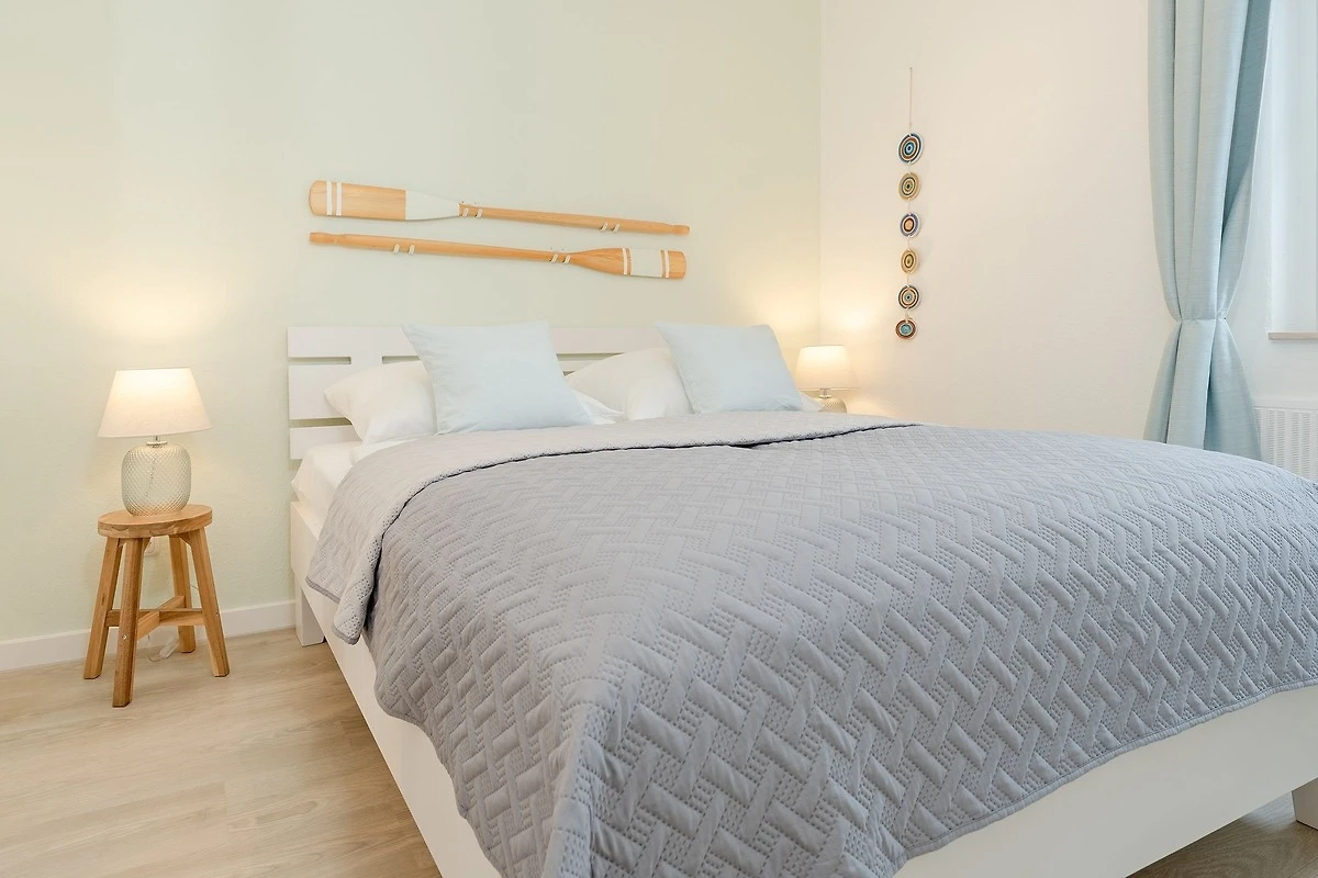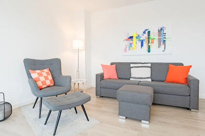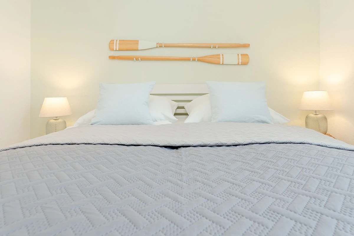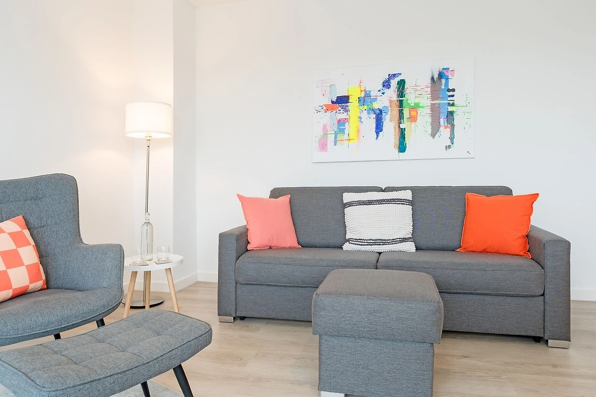 Die Wohnung war bei Ankunft sehr sauber. Die Einteilung der Räume ist sehr gut. Da die Wohnung in der 3.Etage (ohne Fahrstuhl), also ganz oben liegt, gibt es keine Wohnung darüber und im Übrigen nur eine Wand zur Nachbarwohnung, die ebenfalls eine Ferienwohnung ist. Zu dieser Wohnung ist es aber etwas hellhörig. Die Fensterfront (Balkonfenster) im Wohnzimmer sind mit elektrischen Rollos versehen und so kann man nachts komplett abdunkeln. Im Schafzimmer sind leider nur Verdunkelungsvorhänge. Das Gästebett im Wohnzimmer ist aber sehr gut und auch dort kann man schlafen. Die Lage der Wohnung ist top. Man ist sehr schnell an der Strandpromenade. Die Bäckerei Junge ist keine 5 Minuten zu Fuß entfernt und wenn man online bestellt und bezahlt, geht man Früh ganz entspannt an der Schlange vorbei zur Abholstation und muss nicht anstehen. Der Tiefgaragenstellplatz ist riesig und sicher. Man kann die Tiefgarage nur mit dem Schlüssel betreten. Vermisst haben wir eine Dusche, denn das Abduschen in der kleinen Badewanne ist etwas umständlich. Die Duschwand müsste mal getauscht werden. Auch der Toilettendeckel hatte seine beste Zeit gehabt und dürfte gerne einmal getauscht werden. Endlich mal eine Ferienwohnung, in der genug Handtuchhaken vorhanden waren ... jetzt müssten die Handtücher vom gebuchten Wäschepaket nur noch eine Schlaufe zum Aufhängen haben. Im Wohnzimmer hätten wir lieber eine Kommode gehabt als dieses eher unpraktische und mit Gläsern vollgestellte Schiebetürenschränckchen. Aber das ist Meckern auf hohem Niveau. Leider gab es in der Küche keine großen Essteller. Ansonsten war im Wesentlichen alles vorhanden.