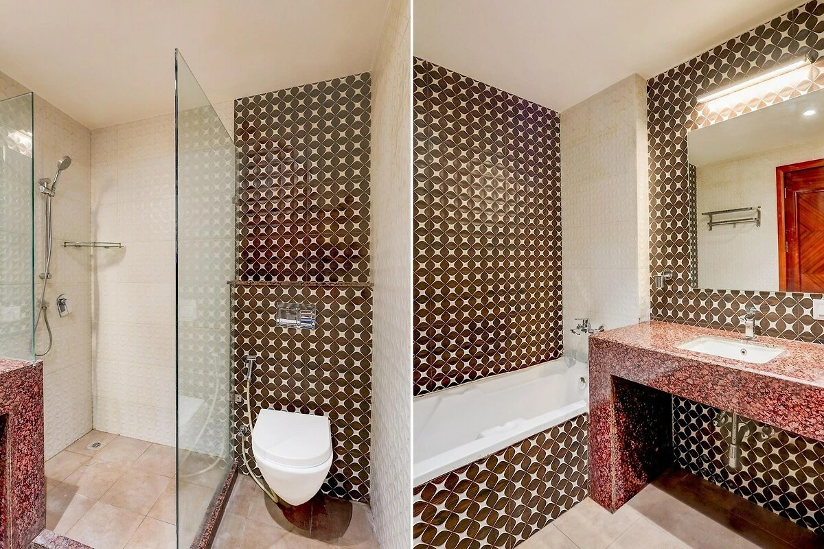 Parterre: (slaapkamer(2-pers. bed, TV, zithoek, airconditioning, lift, Handdoeken inbegrepen, telefoon, Floor mattress), badkamer(bad of douche, douche, wastafel, toilet, , , ))