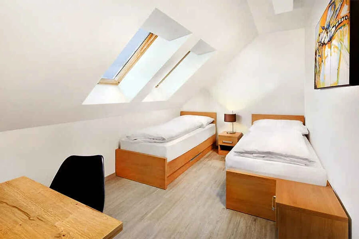 Uw vakantiewoning: Uw vakantiewoning beslaat 1 verdieping, 2 kamers (daarvan 1 slaapkamer), is 55 m² groot en is geschikt voor maximaal 5 personen. Roken is binnen niet toegestaan. De ingang is geschikt voor rolstoelgebruikers. De indeling van de kamers is als volgt: woon/slaapkamer met 3 extra bedden op slaapbank, zithoek en TV. slaapkamer met 1 tweepersoonsbed. Kooknis met koelkast, magnetron en elektrische waterkoker. badkamer met douche, WC en haardroger.