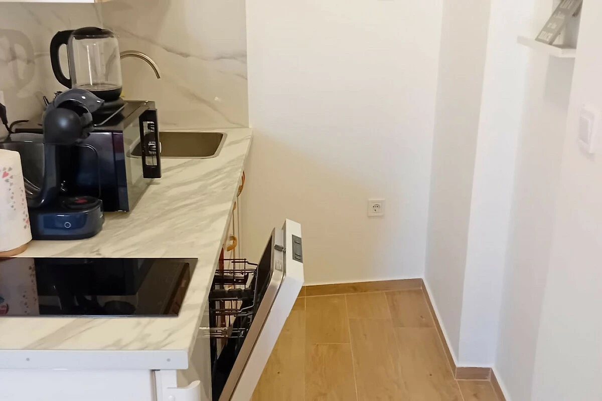 De open keuken, elektrisch fornuis, is uitgerust met koelkast, magnetron, vriezer, vaatwasmachine, servies/bestek, keukengerei, koffiezetapparaat, broodrooster, waterkoker, kachel, borden en schalen, keukengerei.