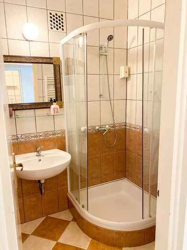 Uw vakantiewoning: Uw studio beslaat 1 verdieping, 1 kamers (daarvan 1 slaapkamer), is 20 m² groot en is geschikt voor maximaal 2 personen. Een airconditioning zorgt op hete dagen voor een aangename temperatuur. Op koude dagen kan uw studio verwarmd worden met centrale verwarming (gas). Roken is binnen niet toegestaan. De ingang is im Erdgeschoss en gelijkvloers en leidt direct in de gang met deuren naar alle kamers. De indeling van de kamers is als volgt: slaapkamer met 1 tweepersoonsbed en 1 ledikant, TV en Nachtkastjes en lampen, Kluisje, Hardhouten vloeren, Stopcontact bij het bed, Kledingkast met kledingrek, Spiegel. Kooknis met eethoek, elektrisch fornuis (keramische kookplaat, 2 kookplaat), koelkast (vriesvak), magnetron, koffiemachine, broodrooster, elektrische waterkoker en Koolmonoxidemelder bevindt zich naast de kitchenette. De eethoek heeft plaats voor 2 personen. badkamer met douche, 1 wastafel, haardroger, droogtrommel en Handdoeken, spiegel, zeep. aparte WC met WC.