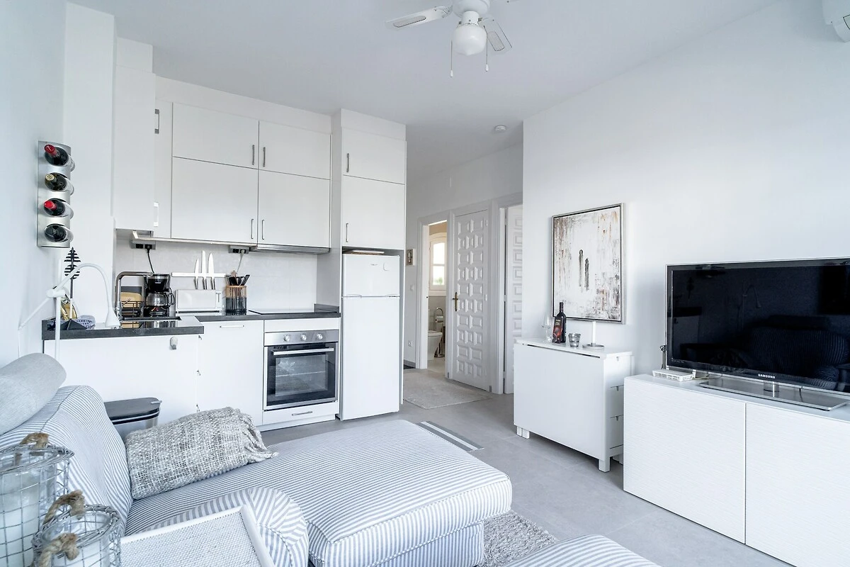 Open keuken(waterkoker, broodrooster, koffiezetapparaat, oven, magnetron, afwasmachine, koelkast, vriezer, ), woon/eetkamer(TV, eettafel, zithoek), slaapkamer(2-pers. bed), badkamer(douche), Internettoegang, wasmachine, balkon, airconditioning, terras, zwembad(gedeeld met andere gasten), strijkijzer, haardroger, Mountain view, Wine glasses
