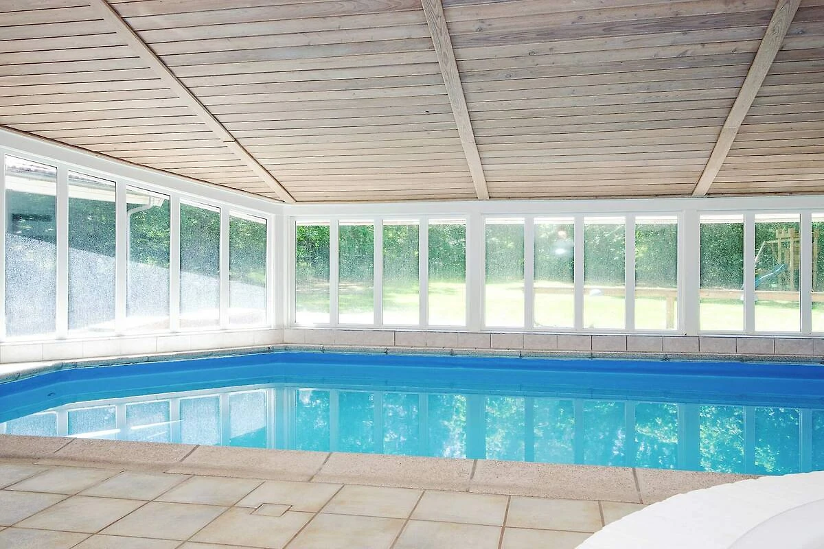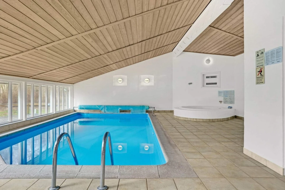 , keuken(fornuis(2 kookplaten), koffiezetapparaat, oven, afwasmachine, koelkast, vriezer(60-99L)), woon/slaapkamer(TV, stereo-installatie), slaapkamer(2-pers. bed), slaapkamer(2-pers. bed), slaapkamer(2-pers. bed), slaapkamer(1-pers. bed, 2x stapelbed), slaapkamer(1-pers. bed, 2x stapelbed), badkamer(wasbak, douche, toilet), badkamer(wasdroger, wasbak, douche, toilet, wasmachine), bubbelbad(in huis, verwarmd, 4 personen), verwarming(elektrisch), terras, tuinmeubilair, ligstoelen, zwembad(in huis), speeltoestellen, lucht-lucht warmtepomp, buitenhaard