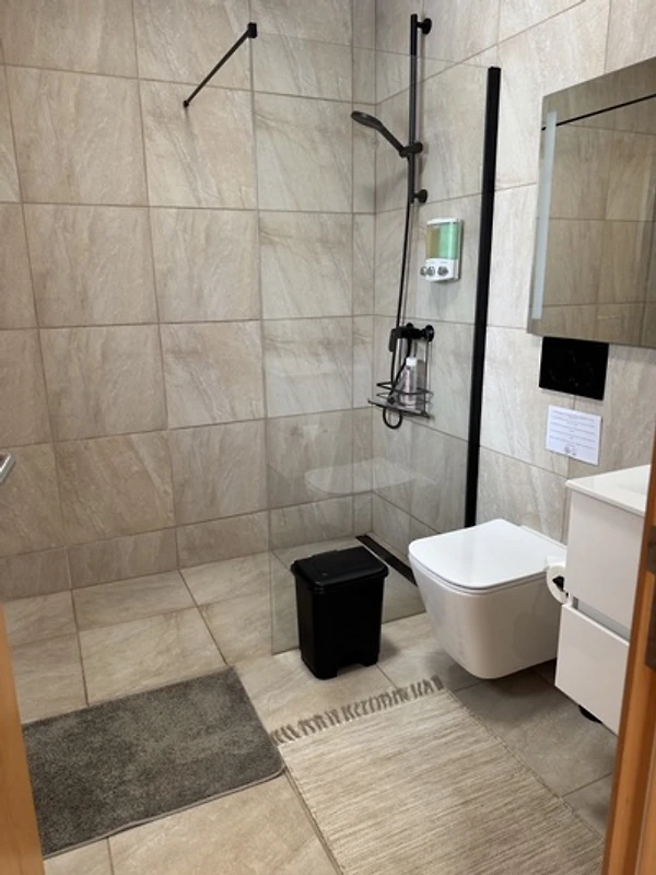 • De gloednieuwe hoofdbadkamer voegt een vleugje luxe toe met een ruime douche en natuurstenen afwerkingen.