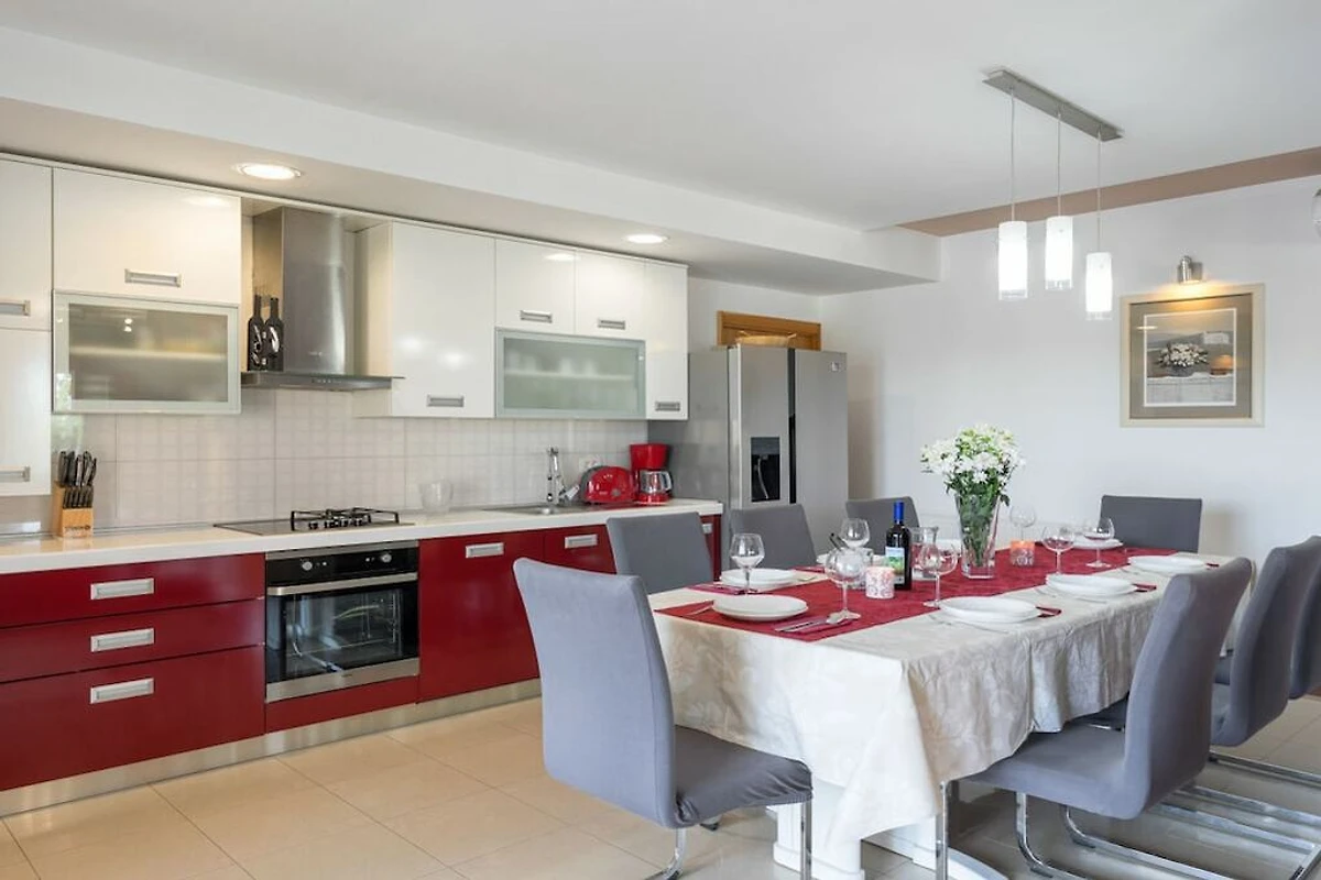 Gasten hebben toegang tot vier slaapkamers en een tweepersoonsslaapbank in de woonkamer, waardoor het ideaal is voor grotere gezinnen of groepen vrienden. Het beschikt ook over vier charmante badkamers voor maximaal comfort en privacy. De begane grond bestaat uit een ruime keuken, eetkamer en woonkamer, die allemaal veel natuurlijk lichtinval hebben. Het huis beschikt over een modern interieur en een grote tuin met een zwembad, een barbecue en een buitentafel waar gasten kunnen genieten van vers bereide maaltijden met familie en vrienden.