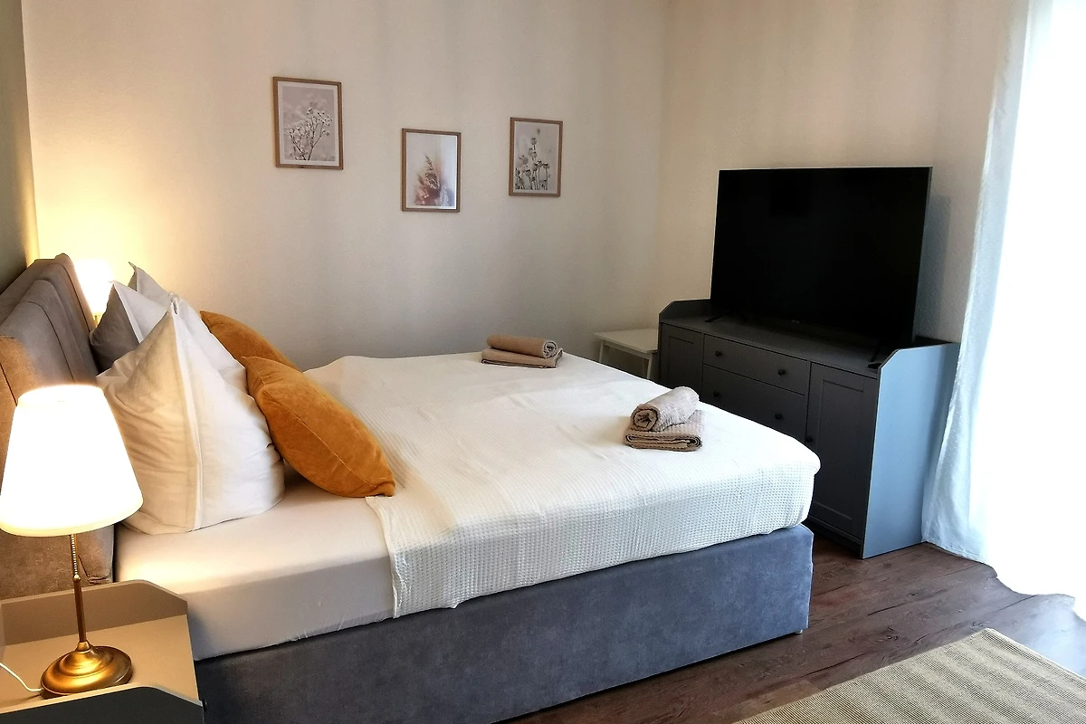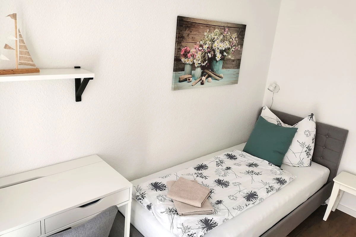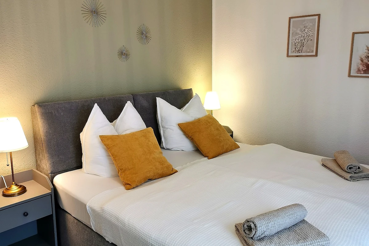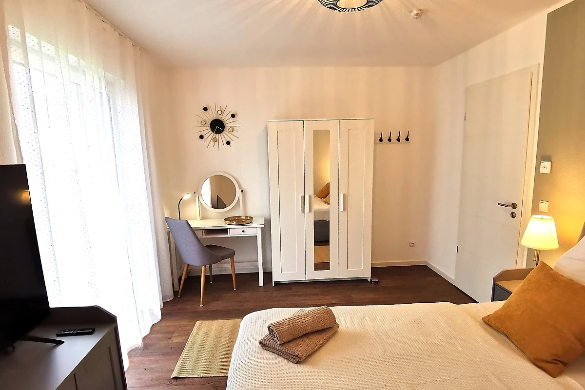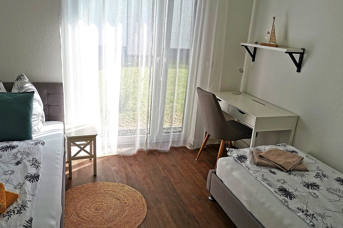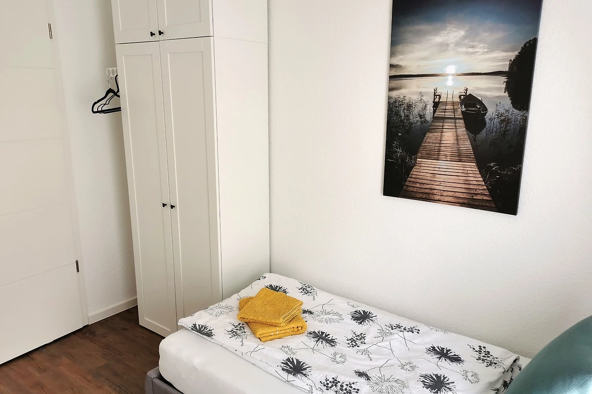 Ontdek het idyllische vakantieverblijf "Seedomizil Goitzsche" nabij de Dübener Heide en op slechts 3 minuten lopen van het Goitzschemeer. Perfect voor een ontspannen vakantie aan het water voor natuurliefhebbers en fietsers. Dit charmante vakantieappartement biedt op 86 m² plaats aan maximaal 4 gasten en is uitgerust met twee slaapkamers, een badkamer en een gastentoilet. Geniet van het comfort van een modern huis, waaronder een volledig uitgeruste kitchenette met vaatwasser, koel-/vrieskast, magnetron, oven, waterkoker en koffiezetapparaat. De gezellige woonkamer nodigt uit tot ontspanning met een televisie en comfortabele zitplaatsen, terwijl de airconditioning voor aangename temperaturen zorgt. Daarnaast is er een wasmachine tot uw beschikking. Het grote terras met barbecuefaciliteit is de ideale plek voor gezellige diners in de open lucht. Een parkeerplaats direct voor de deur zorgt voor comfort. Voor de kleine gasten is er een kinderstoel aanwezig. Twee stand-up-paddleboards behoren bij het appartement. Een dames- en een herenfiets kunnen meegebruikt worden om de mooie omgeving te verkennen.