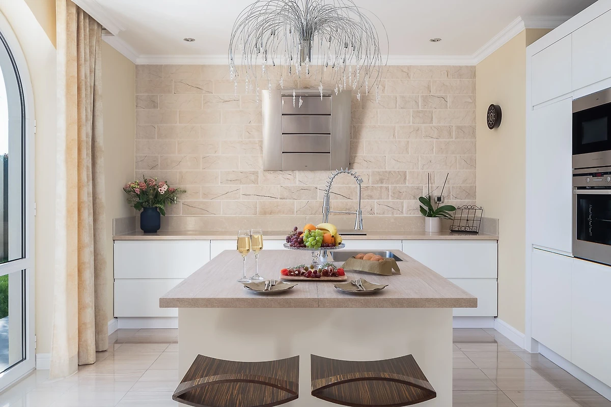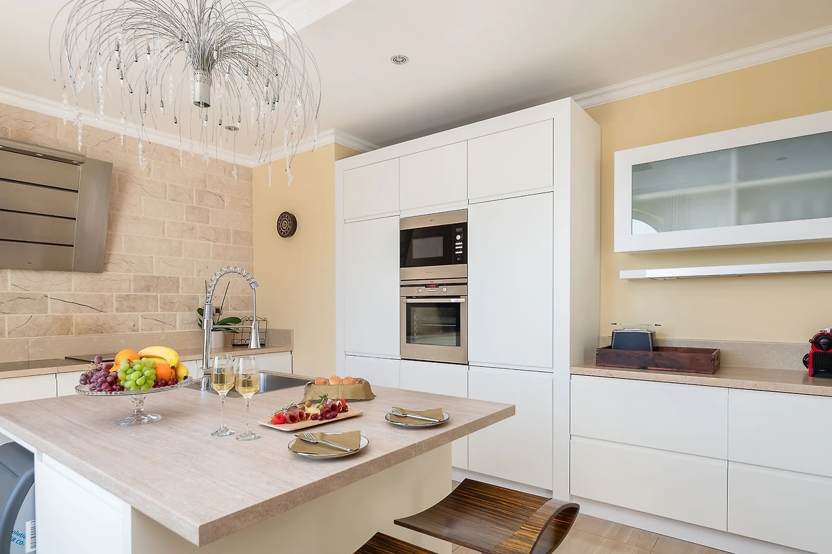 De open keuken, met inductie kookplaat, is uitgerust met koelkast, magnetron, oven, vriezer, vaatwasmachine, servies/bestek, keukengerei, koffiezetapparaat, broodrooster en waterkoker.