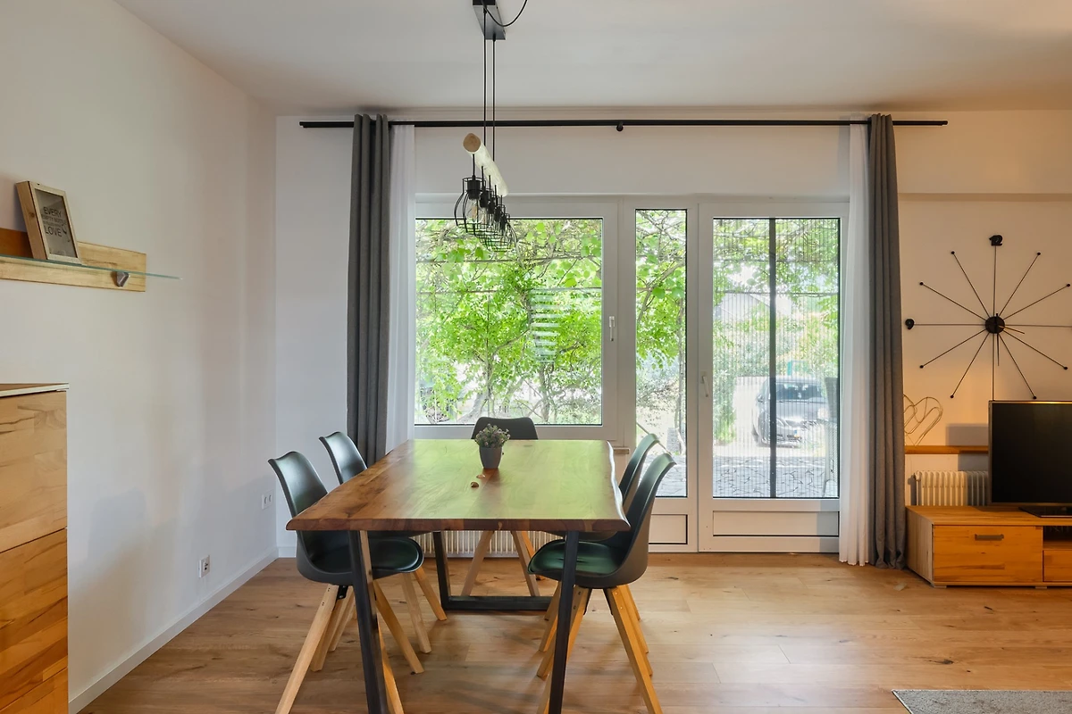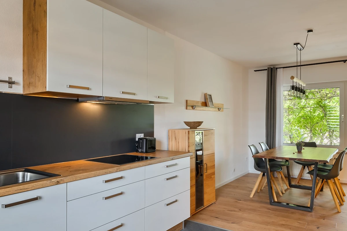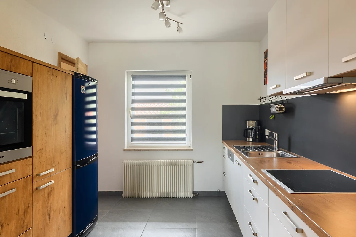 De open keuken, met inductie kookplaat, is uitgerust met koelkast, oven, vriezer, vaatwasmachine, servies/bestek, keukengerei, koffiezetapparaat, broodrooster en waterkoker.