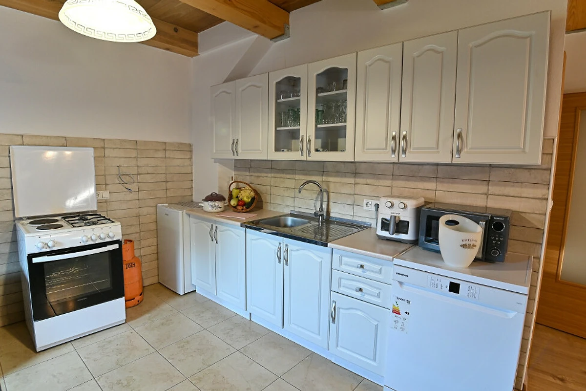De open keuken, met gasfornuis, is uitgerust met koelkast, magnetron, oven, vriezer, vaatwasmachine, servies/bestek, keukengerei, koffiezetapparaat en broodrooster.