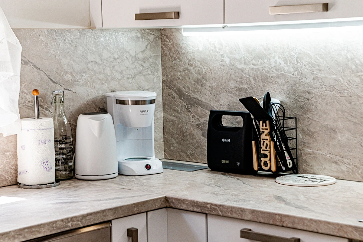 De open keuken, met keramisch fornuis, is uitgerust met koelkast, oven, vriezer, vaatwasmachine, servies/bestek, koffiezetapparaat en broodrooster.
