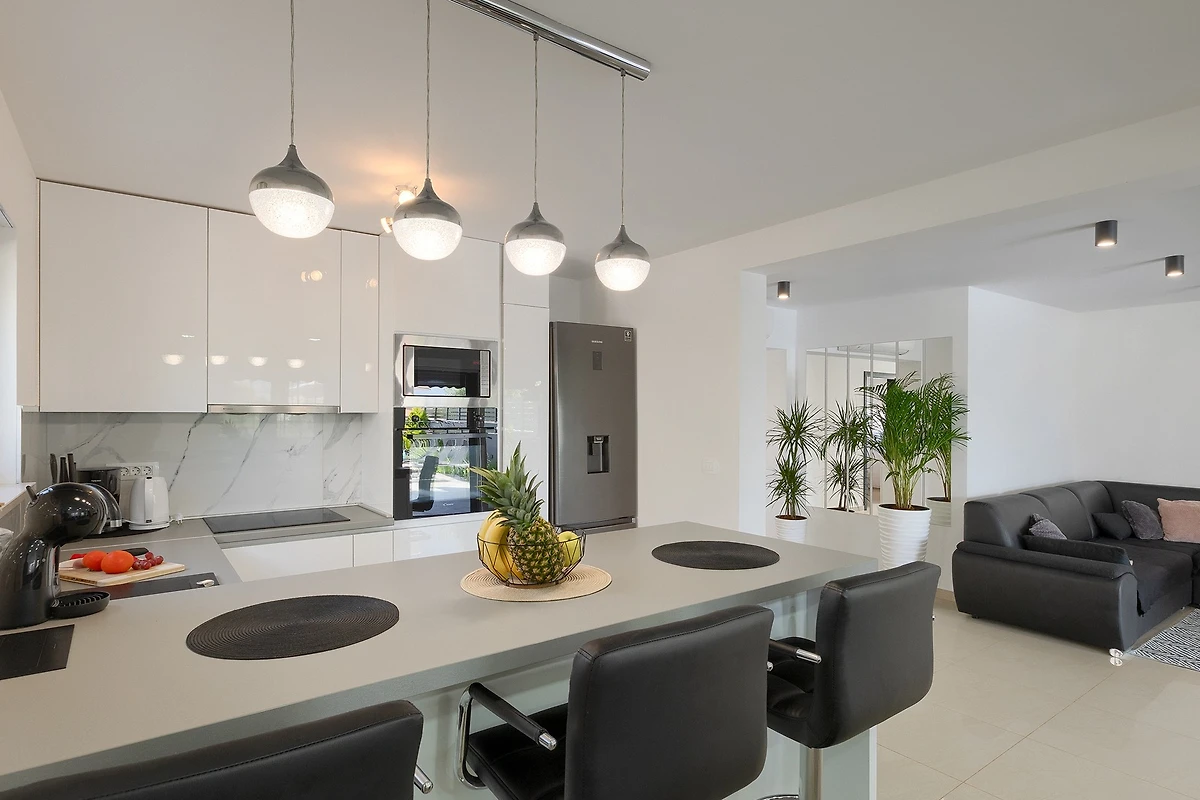 De open keuken, met inductie kookplaat, is uitgerust met koelkast, magnetron, oven, vriezer, vaatwasmachine, servies/bestek, keukengerei, koffiezetapparaat en broodrooster.