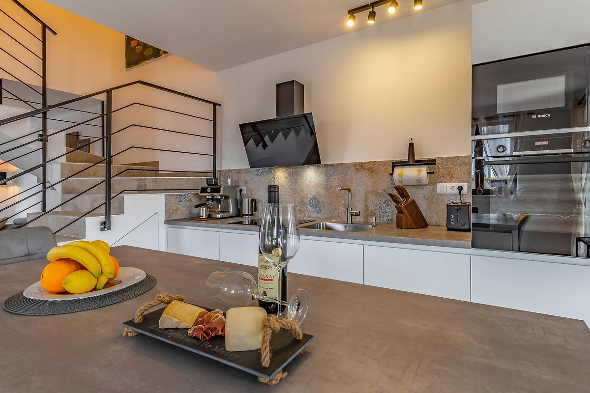 De open keuken, met inductie kookplaat, is uitgerust met koelkast, magnetron, oven, vriezer, vaatwasmachine, servies/bestek, keukengerei, koffiezetapparaat en broodrooster.